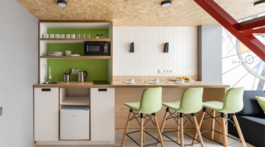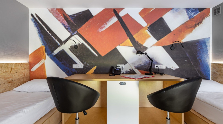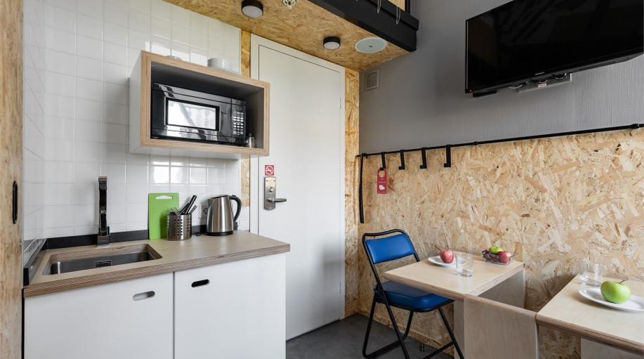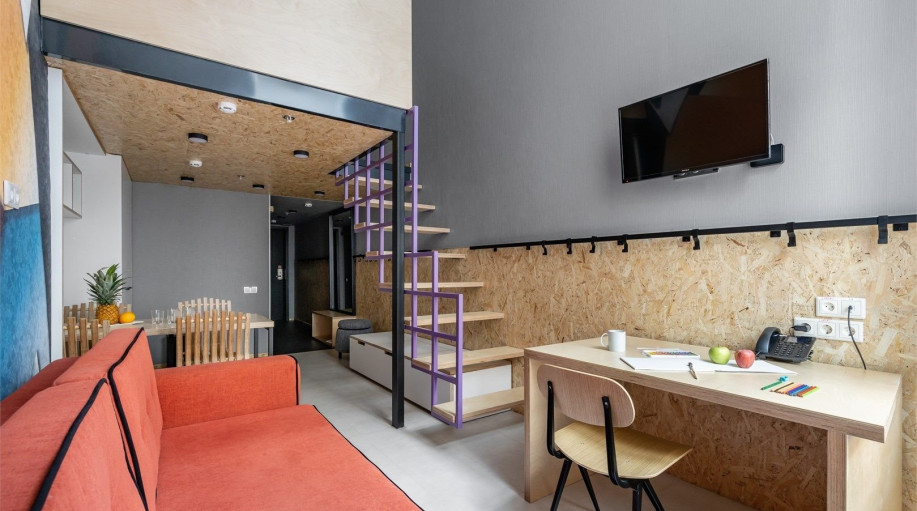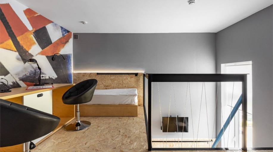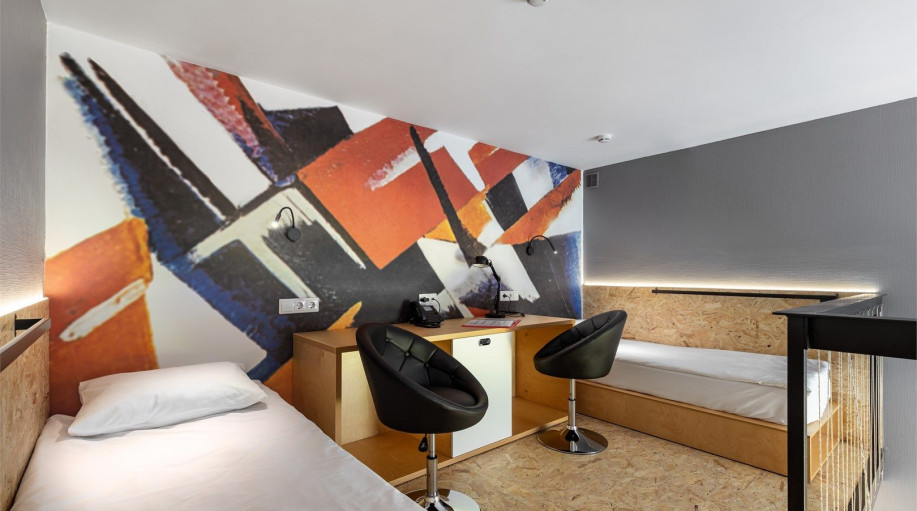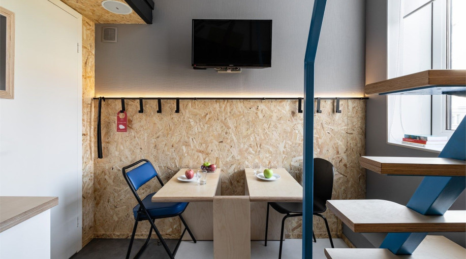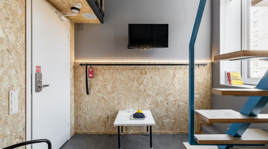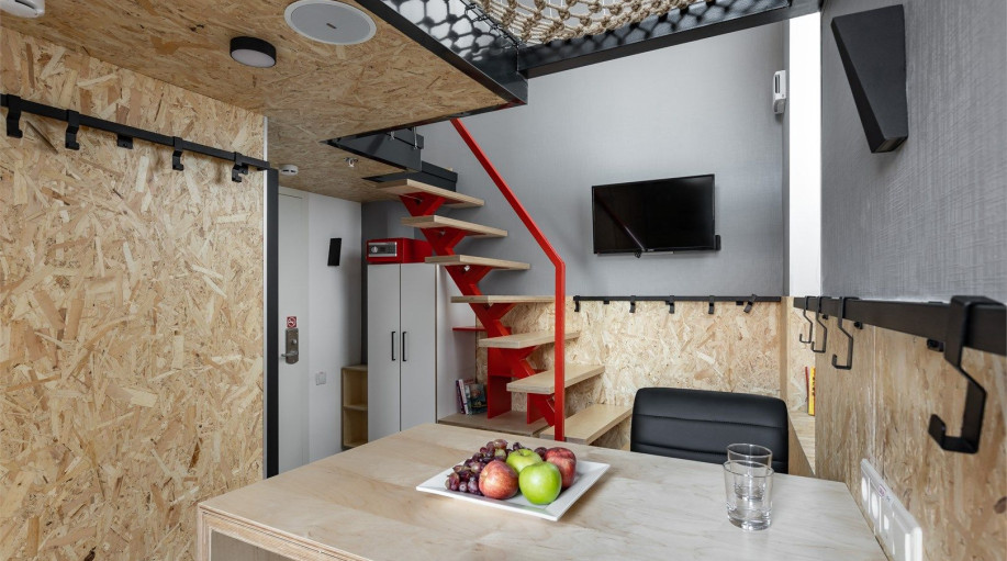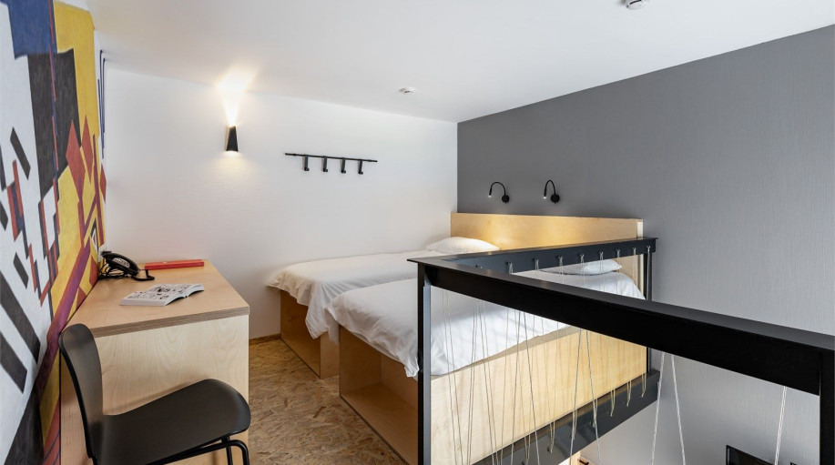 «Экстер» - номер площадью 19,4 м2. На втором этаже расположены две односпальные кровати и рабочие столы. На первом – зона отдыха с телевизором и санузел с душевой кабиной. Номер подойдет для размещения двух гостей...