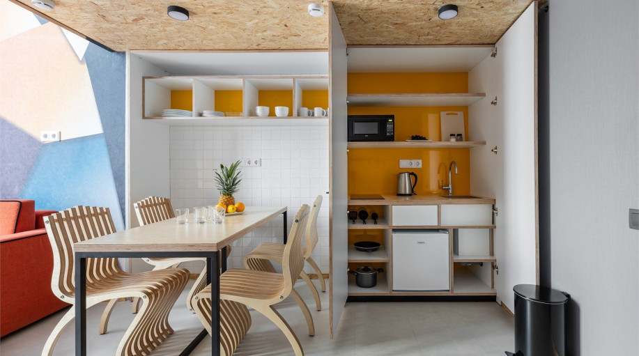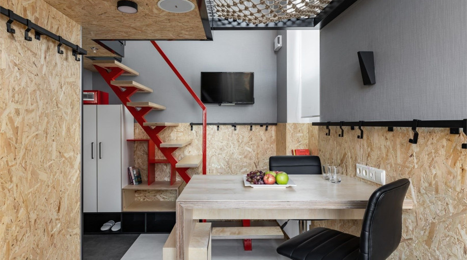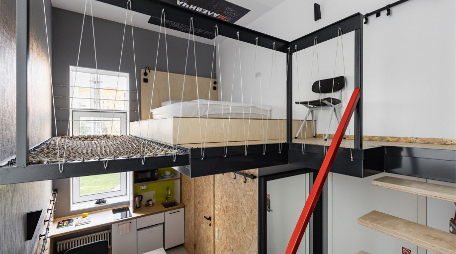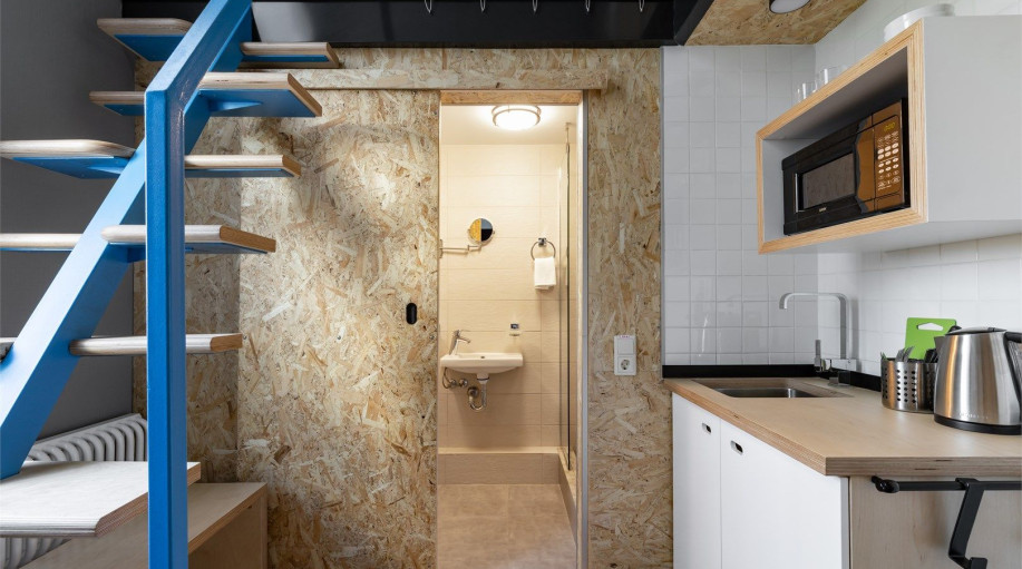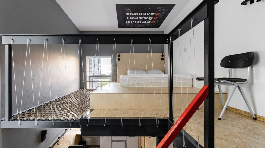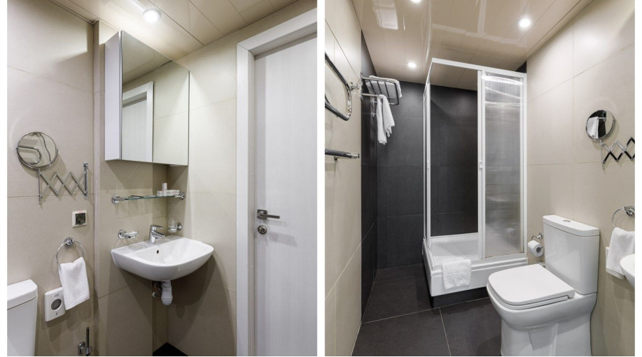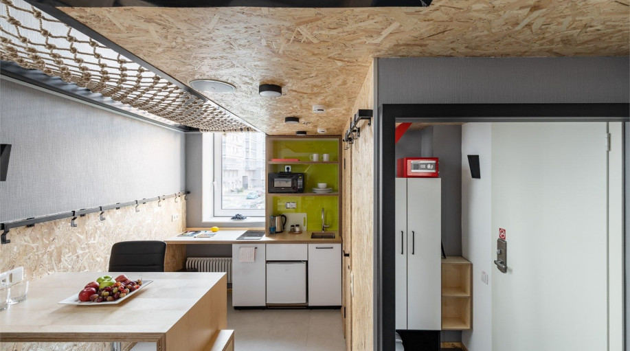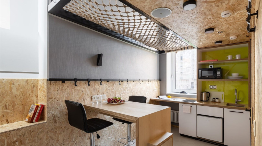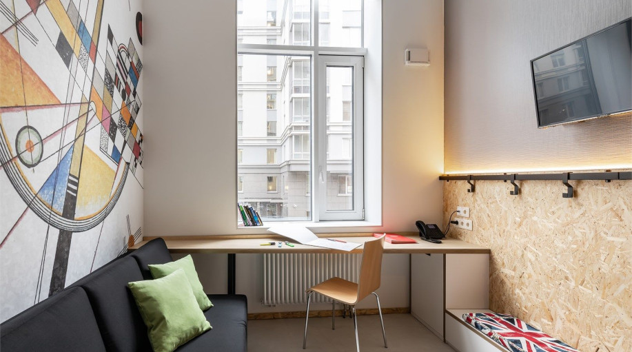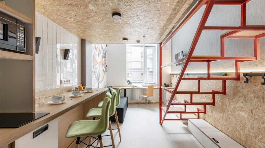 «Экстер» - номер площадью 19,4 м2. На втором этаже расположены две односпальные кровати и рабочие столы. На первом – зона отдыха с телевизором и санузел с душевой кабиной. Номер подойдет для размещения двух гостей...