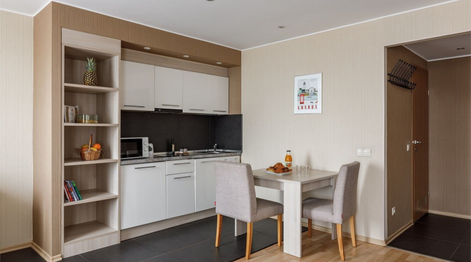Каждый номер апарт-отеля Vertical оснащен кухонной зоной со всем необходимым набором посуды, кроватью с удобным матрацем, рабочим местом и просторной ванной комнатой.