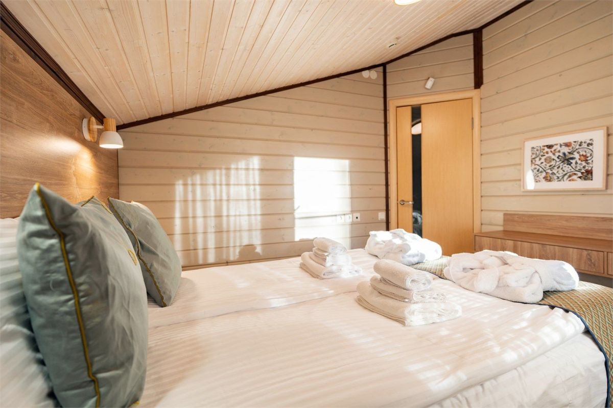 На первом уровне — кухня‑гостиная для совместных обедов, на втором — спальня и комната отдыха. В каждом апарте — сауна.