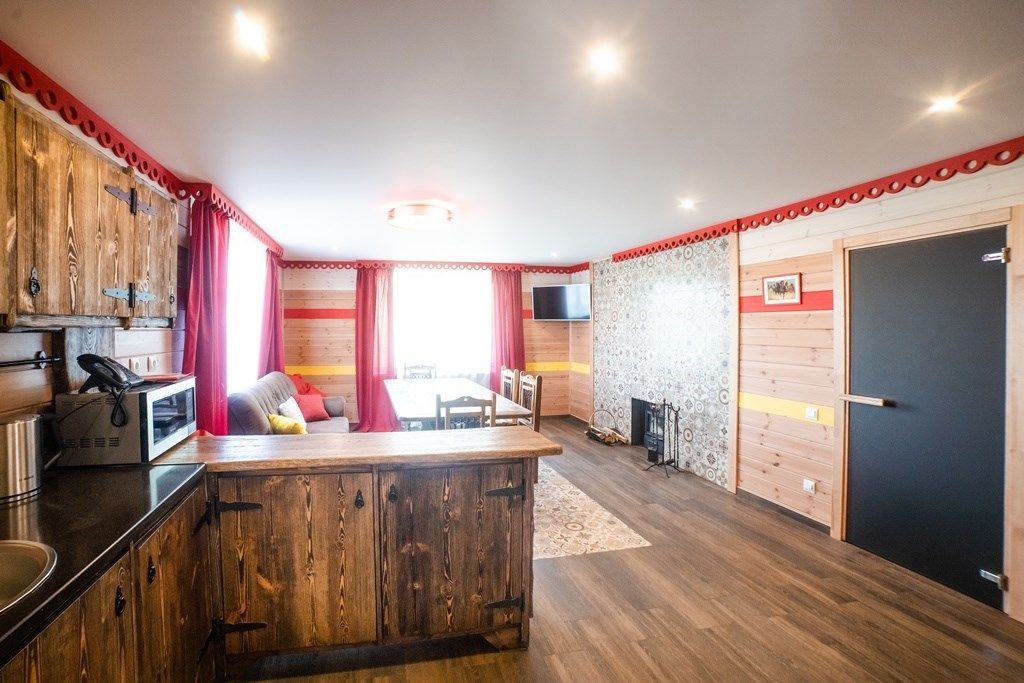 Дом-баня вторит великолепию Больших домов Парк-отеля, встречая гостей просторной гостиной, обставленной с душой и вкусом, где кухонная зона ненавязчиво вписана в интерьер.