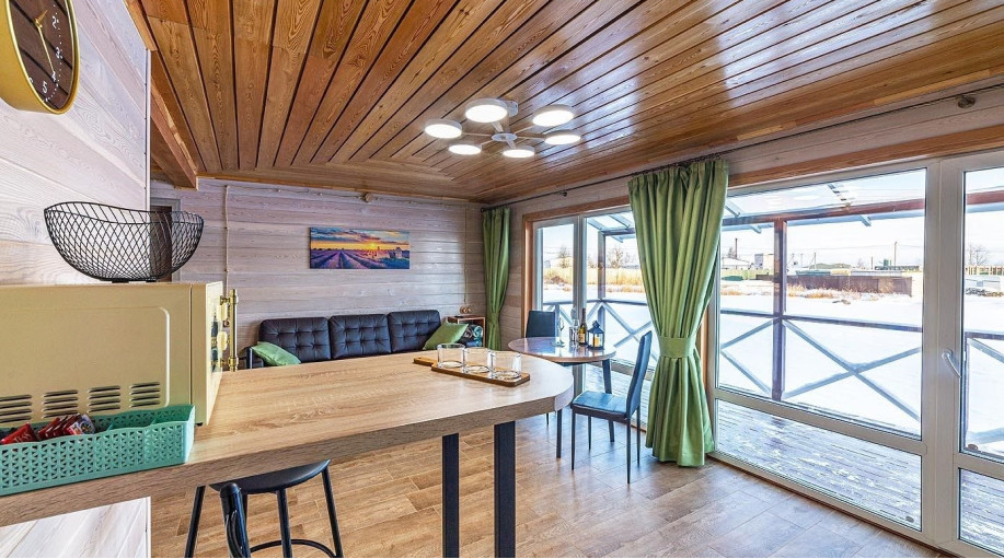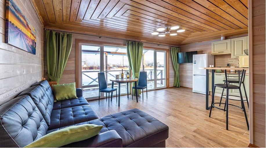 Шикарный новый дом на компанию до 7 человек, с панорамными окнами в пол и прекрасным видом на озеро.