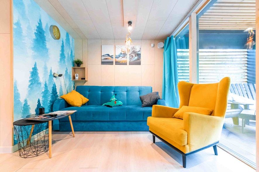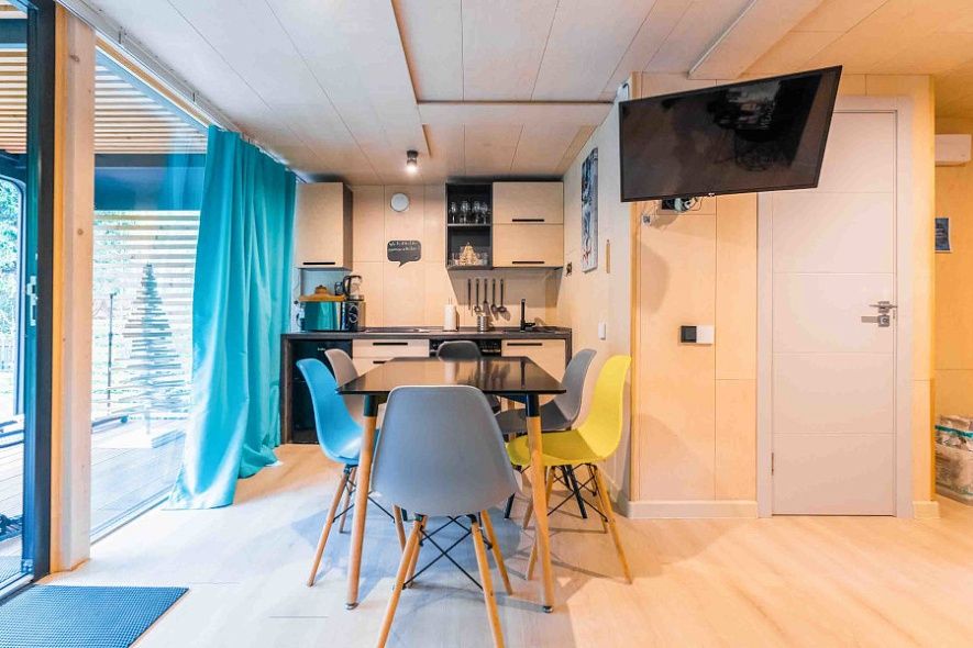 ✔ Внутри каждого дома — стильный интерьер, полностью оборудованная кухня (включая посудомоечную машину), стиральная машина, кофеварка, Smart TV, Wi-Fi, настольные игры