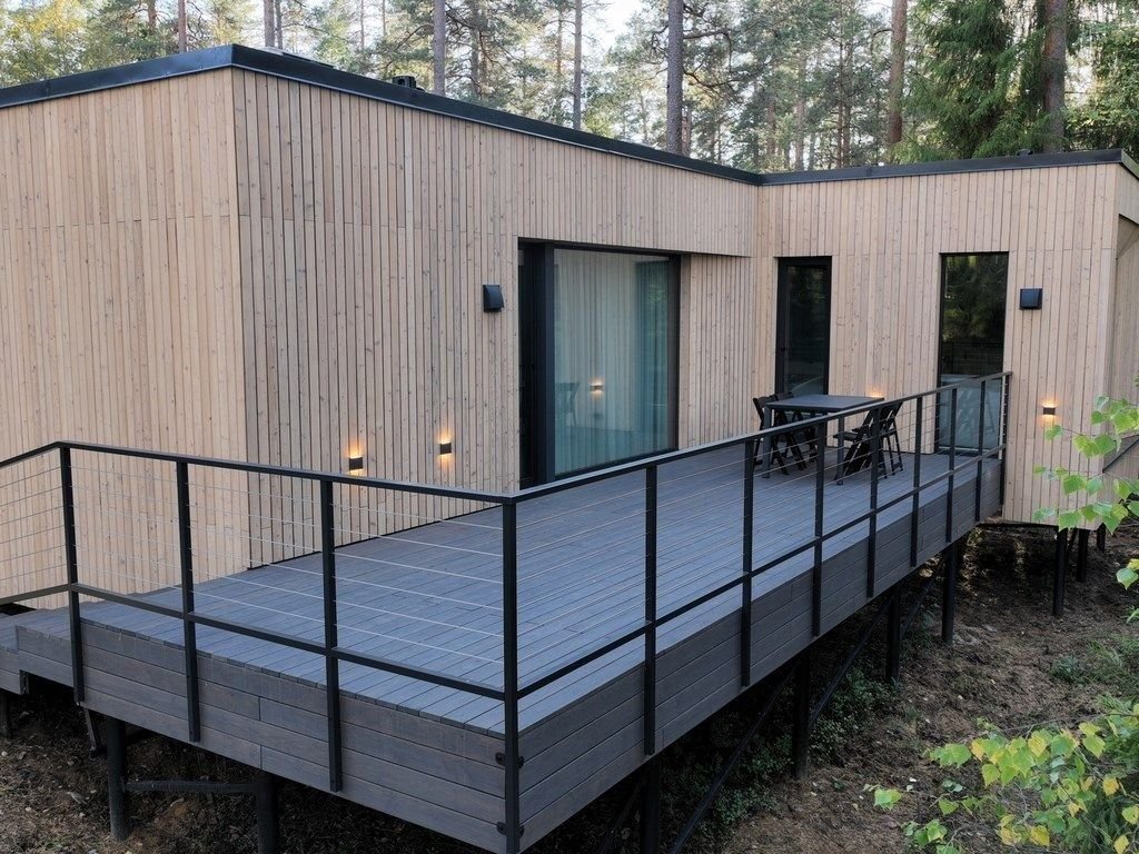 Хюгге Дом — скандинавский уют с террасой у озера Уединённый коттедж в современном скандинавском стиле с просторной террасой и видами на озеро.