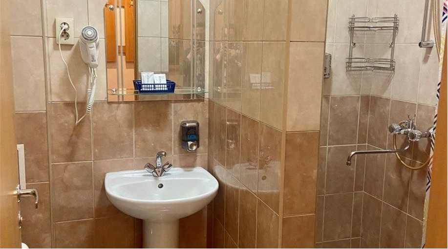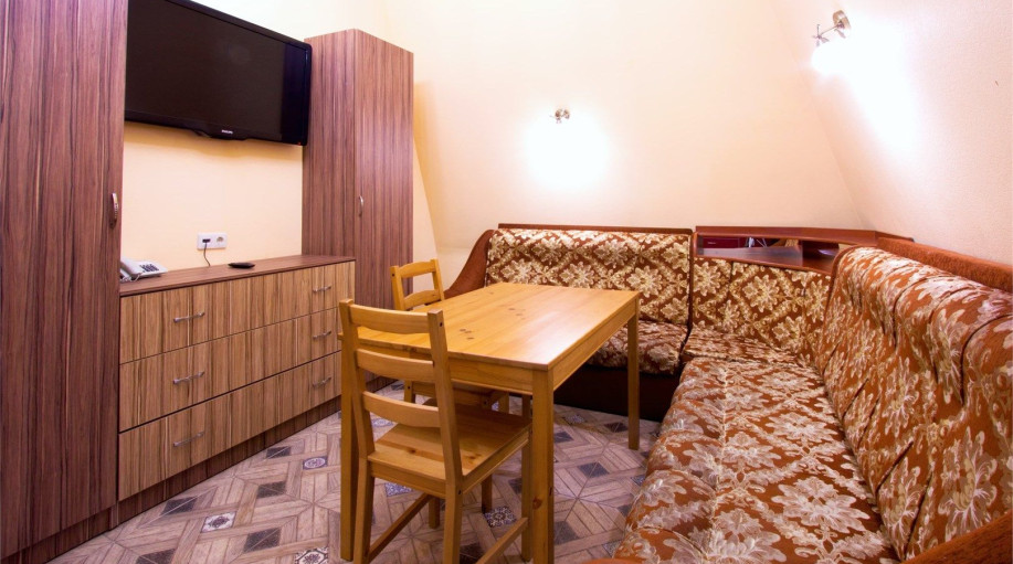 Есть эл.чайник, чай, кофе, сахар, бутилированная вода, тапочки, халаты, зубной набор (по запросу). Номер расположен в 3-м корпусе. Не оборудован кондиционером.