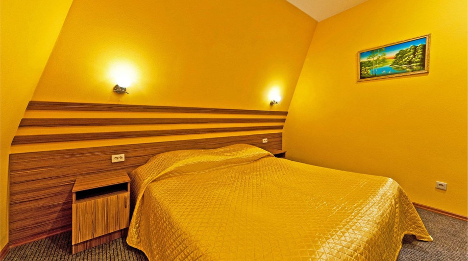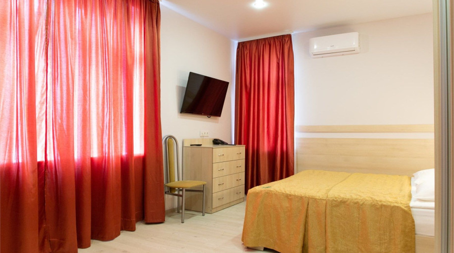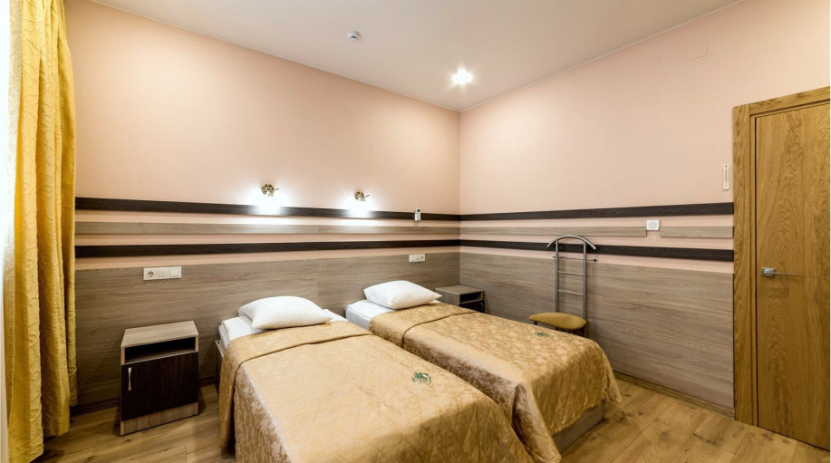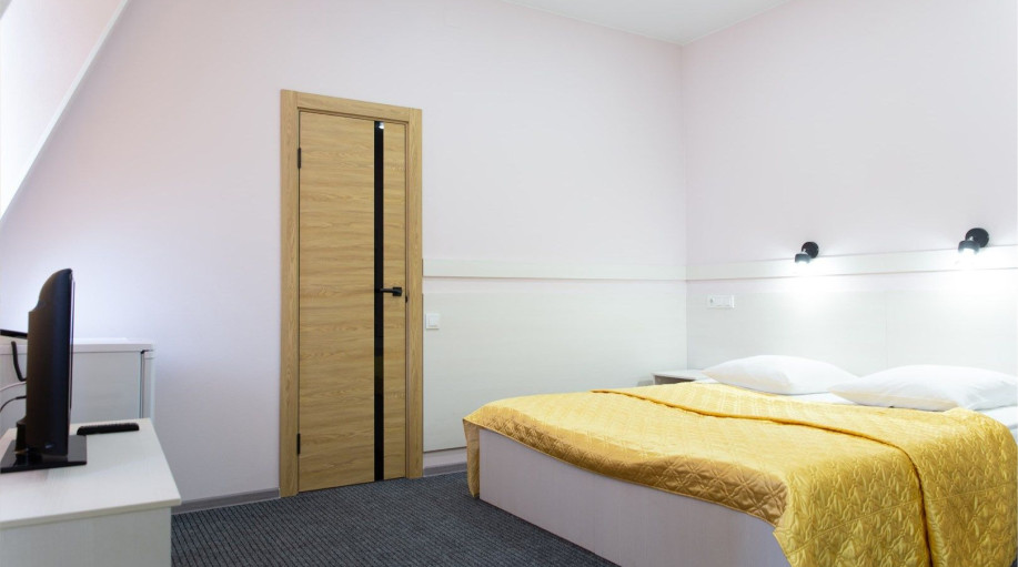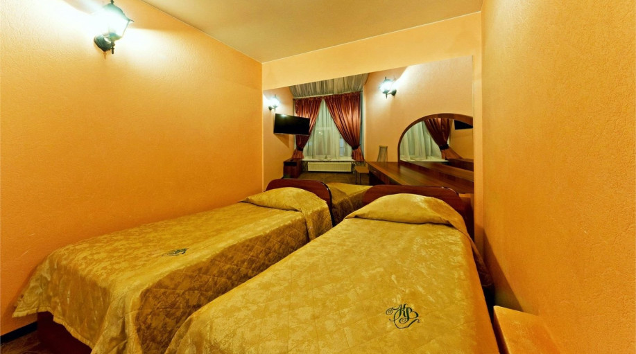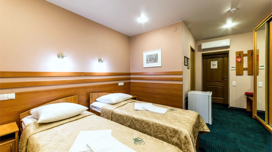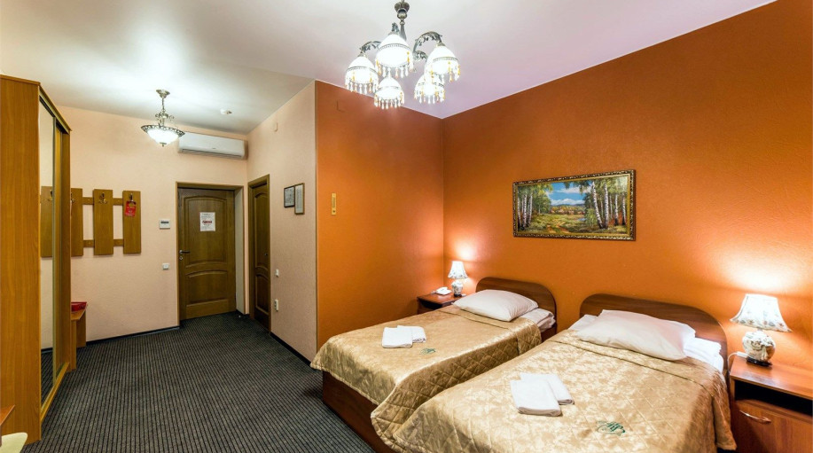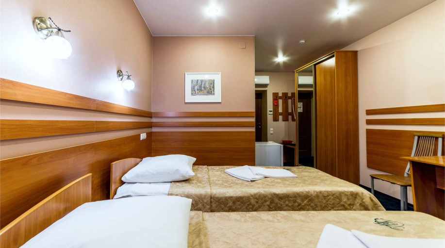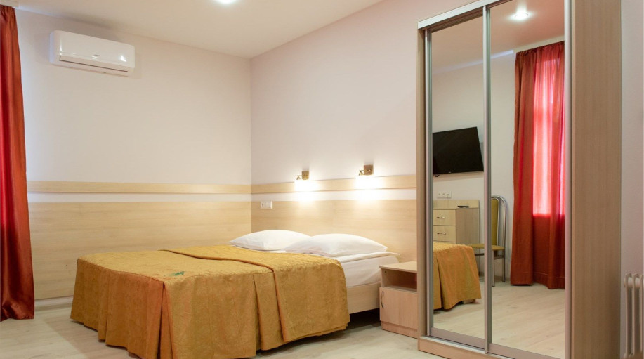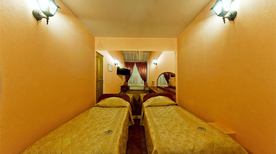Уютный номер, состоящий из спальной комнаты с двумя раздельными кроватями, которые сдвинуты вместе и объединены общим наматрасником (по желанию могут быть раздвинуты), небольшого холла и совмещенного санузла с угловой ванной. Номер расположен во 2 корпусе и оборудован кондиционером.