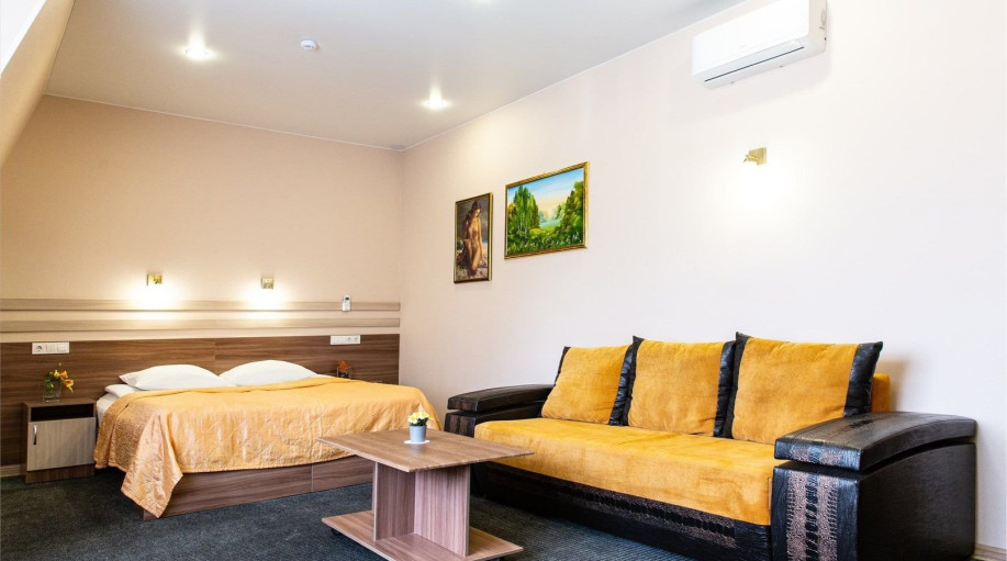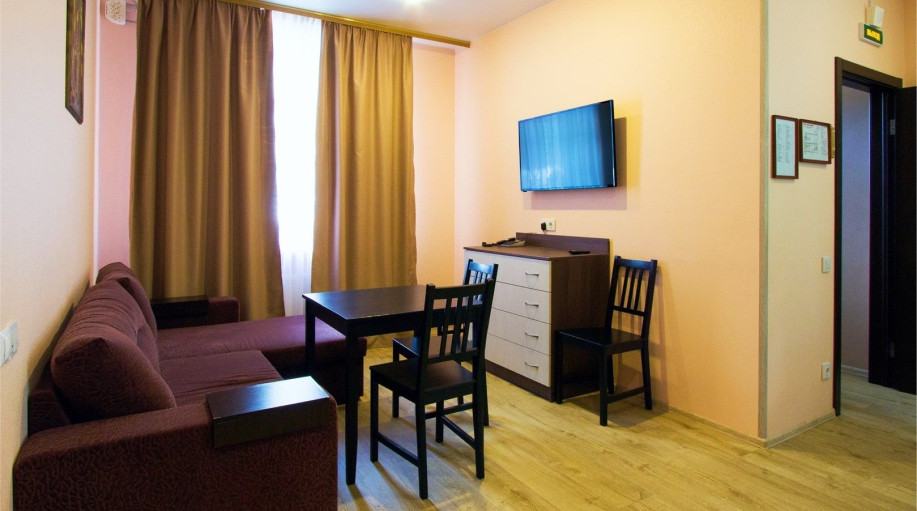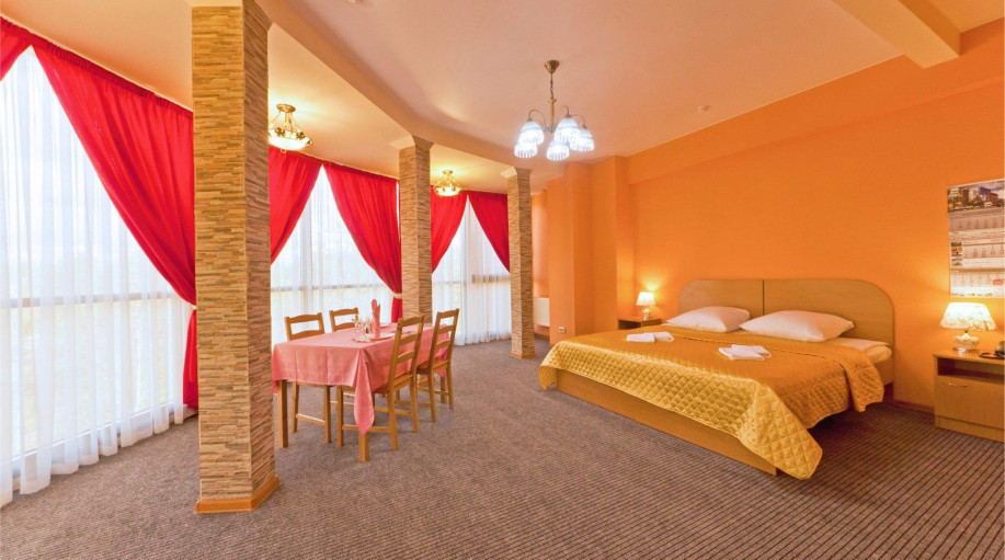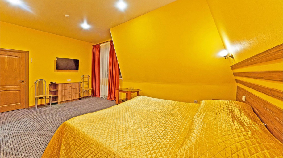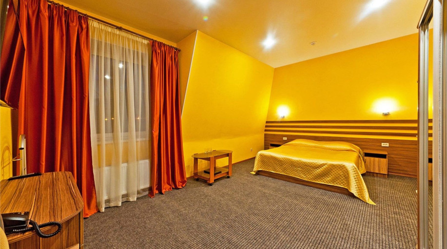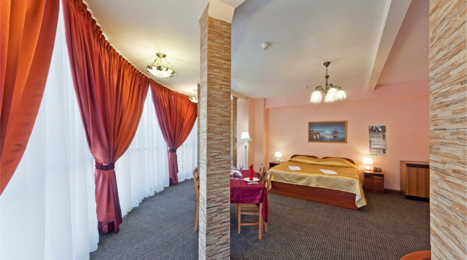 Номер категории "Полулюкс+" - комфортный двухместный номер, состоящий из спальной комнаты с двумя полуторными кроватями (могут стоять вместе или раздельно) или одной двуспальной, небольшого холла и санузла.