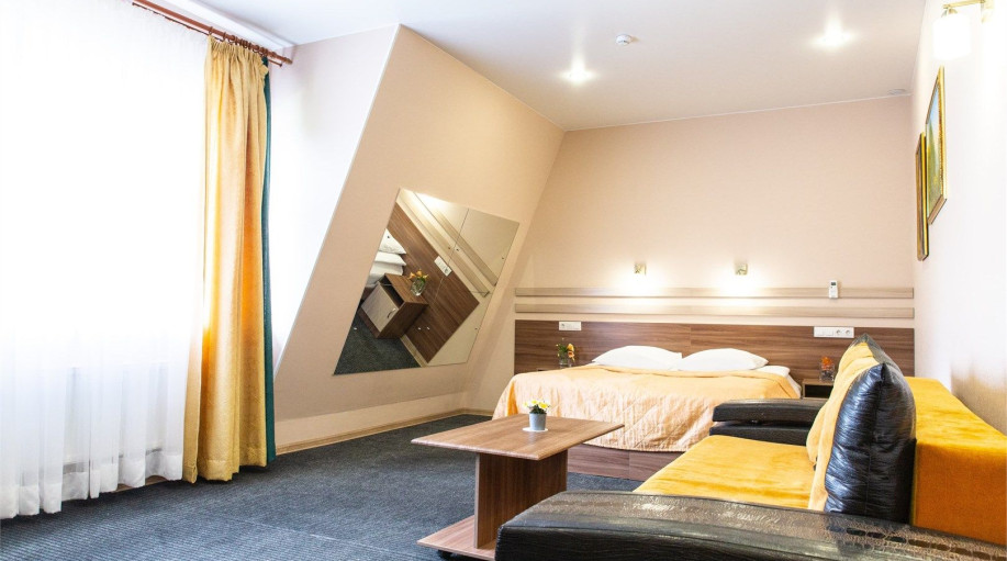 Номера категории "Полулюкс+" - комфортный двухместный номер, состоящий из спальной комнаты с двумя полуторными кроватями (могут стоять вместе или раздельно) или одной двуспальной (с единым наматрасником), небольшого холла и санузла.