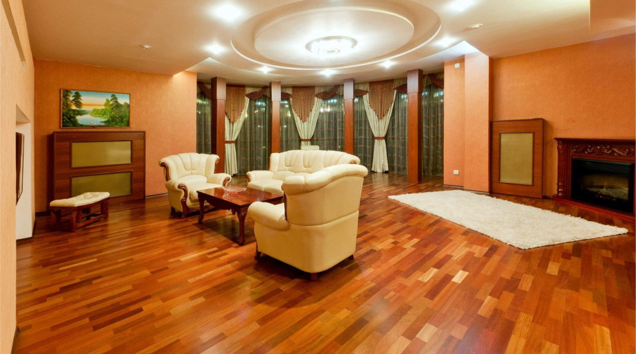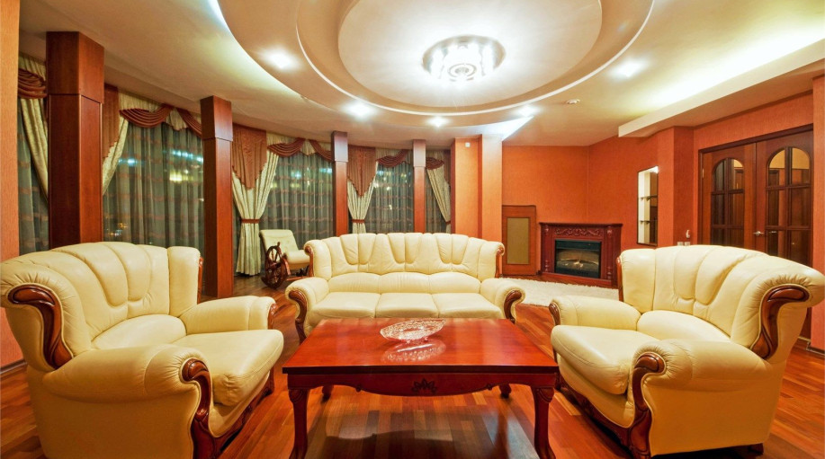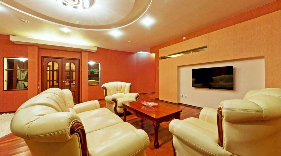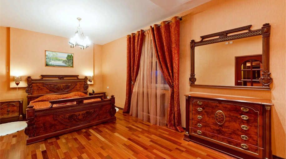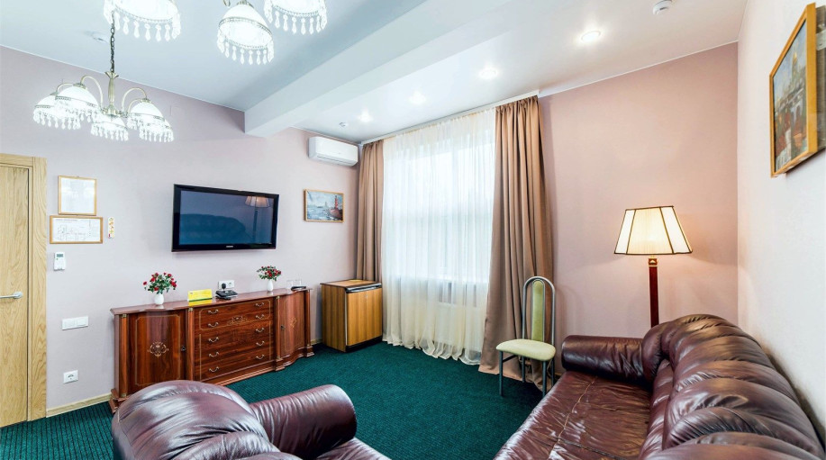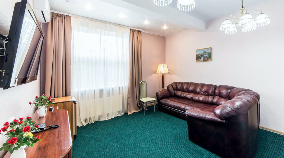 Превосходная резиденция на 5-ом этаже в 1-м корпусе гостиничного комплекса «К-Визит». Уютная спальная комната с резной мебелью. Гостиная с электрическим камином, белой кожаной мебелью и креслом-качалкой, воздушный текстиль, панорамные окна.