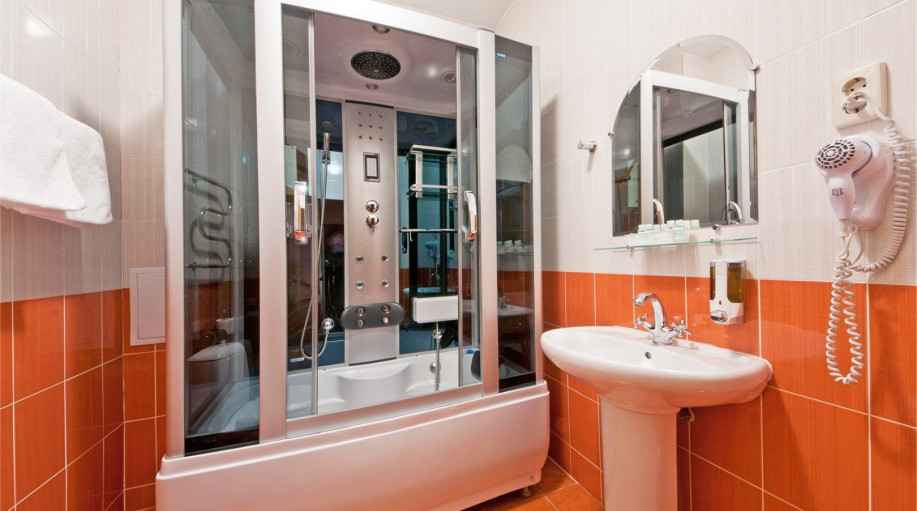 Светлые просторные Люксы на 3-м и 4-м этажах 1-го корпуса отеля «К-Визит» с панорамными окнами. Номера выполнены в пастельных тонах. Совмещенный санузел, душевая кабина с гидромассажем. Есть эл.чайник, чай, кофе, сахар, бутилированная вода, тапочки, халаты, зубной набор (по запросу). Номера оборудов..