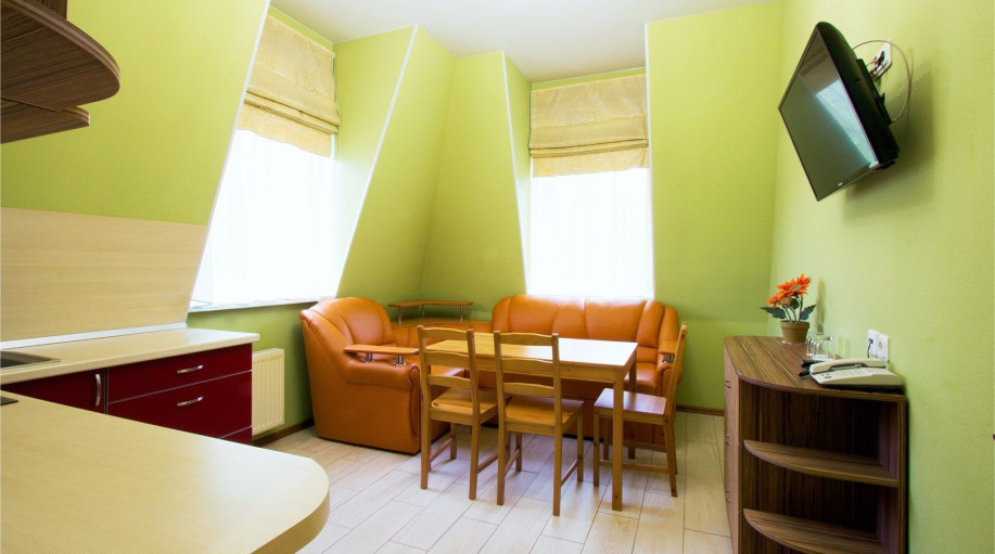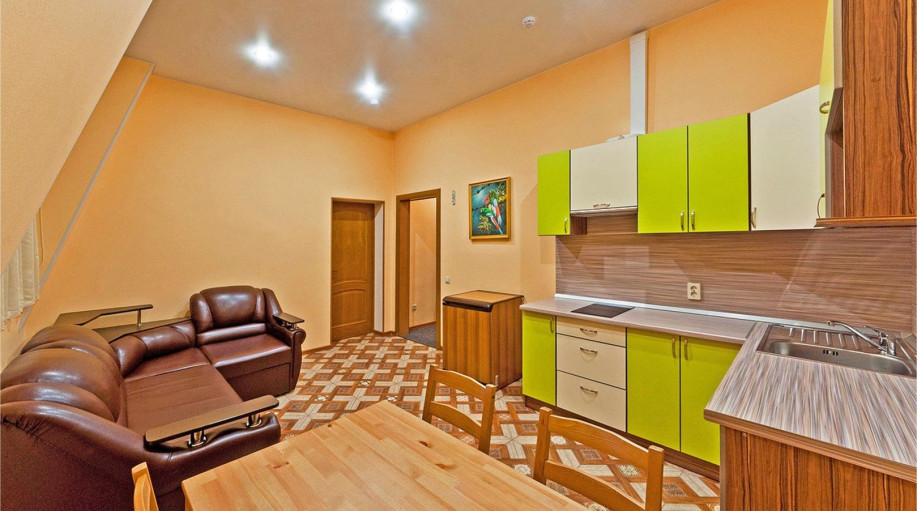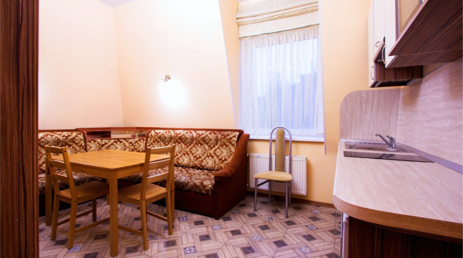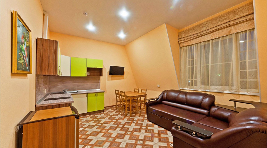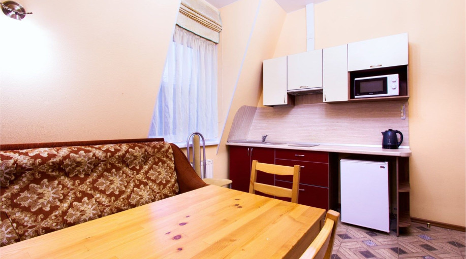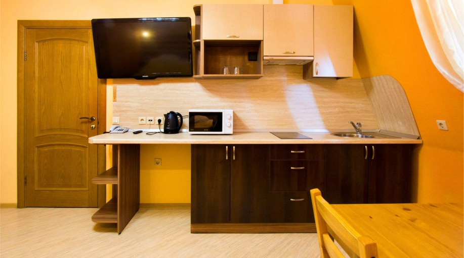 Уютные апартаменты с 1-й спальной комнатой, кухней и совмещенным санузлом. Кухня оборудована варочной панелью, холодильником, эл. чайником, есть вся необходимая посуда, чай, кофе, сахар, бутилированная вода, тапочки, халаты, зубной набор (по запросу). Номер расположен в 3-м корпусе. Не оборудован ко..