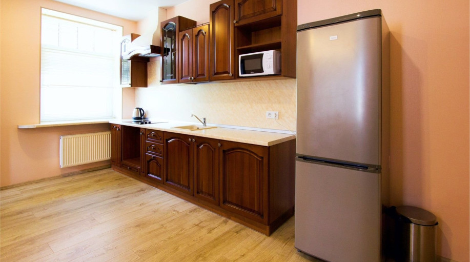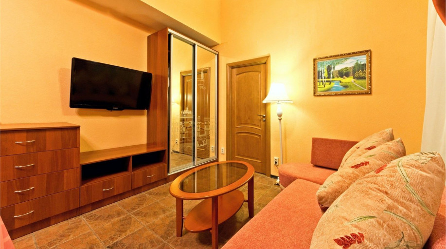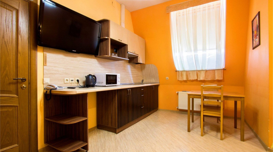 Уютные апартаменты с 1-й спальной комнатой (выполненной в персиковых тонах), кухней и совмещенным санузлом. Кухня оборудована варочной панелью, холодильником, эл. чайником, есть вся необходимая посуда, чай, кофе, сахар, бутилированная вода, тапочки, халаты, зубной набор (по запросу). Номер расположе..