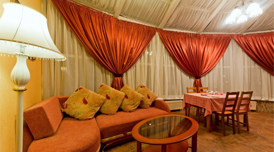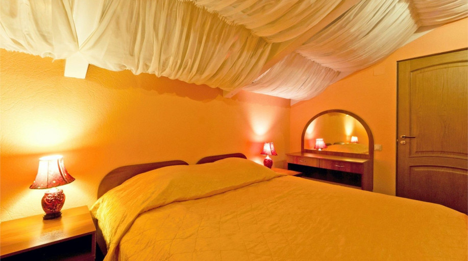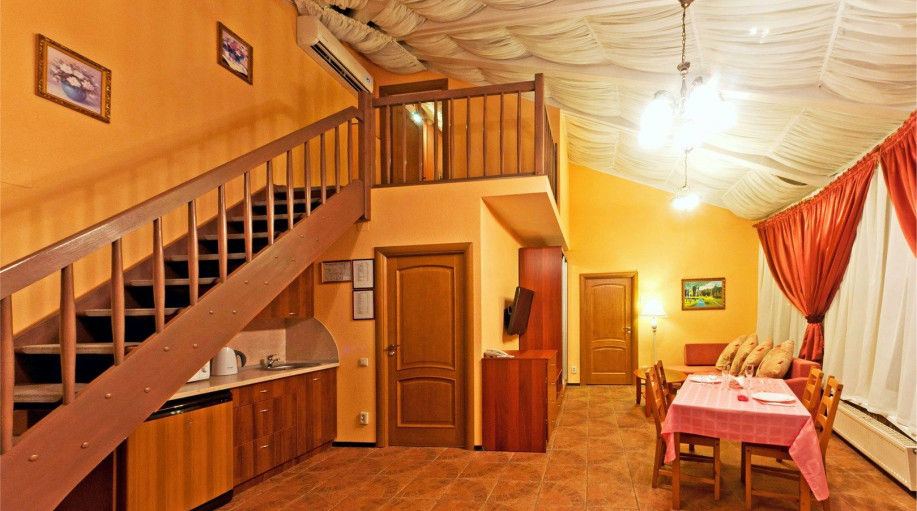 Оригинальный двухуровневый люкс под стеклянным куполом, 2 спальни, гостиная с диваном и мини-кухней. Есть чайник, чай, кофе, сахар, бутилированная вода, тапочки, халаты, зубной набор (по запросу). Номер выполнен в пастельных тонах. Совмещенный санузел, душевая кабина с гидромассажем. Номер расположе..
