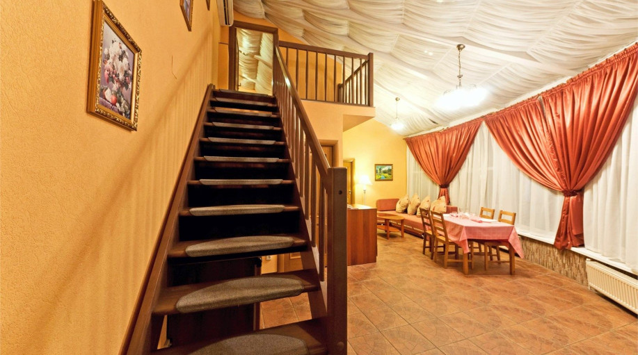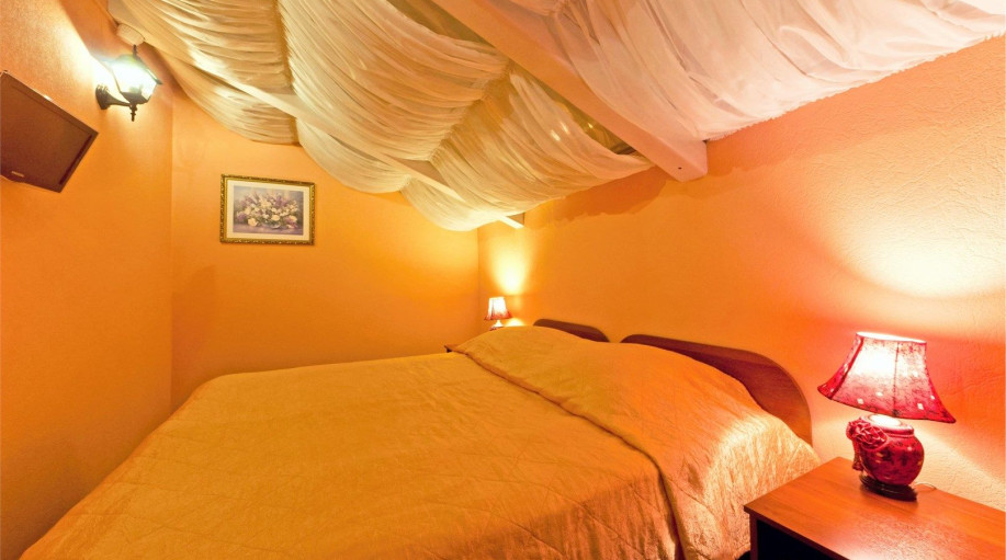 Уютный двухкомнатный Люкс №6 с двуспальной кроватью состоит из спальной комнаты, гостиной с большим кожаным диваном, небольшого холла и совмещенного санузла с джакузи и биде. Есть эл.чайник, чай, кофе, сахар, бутилированная вода, тапочки, халаты, зубной набор (по запросу). Номер расположен во 2-м ко..