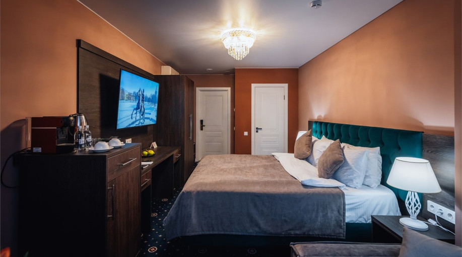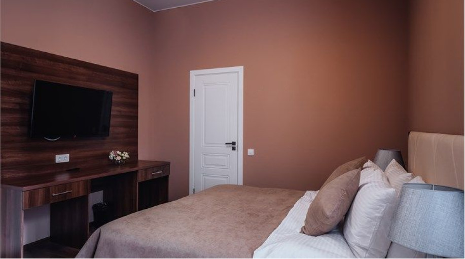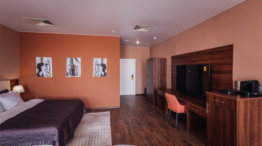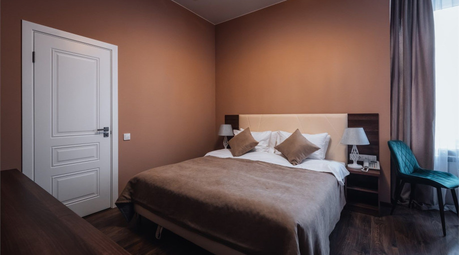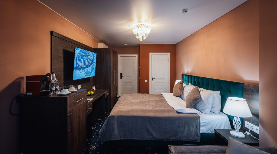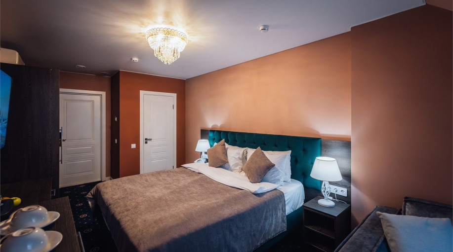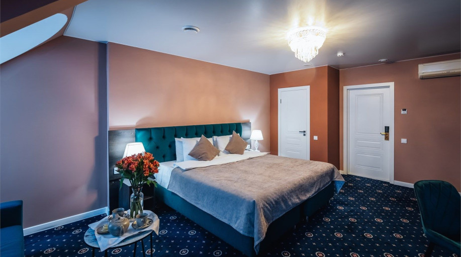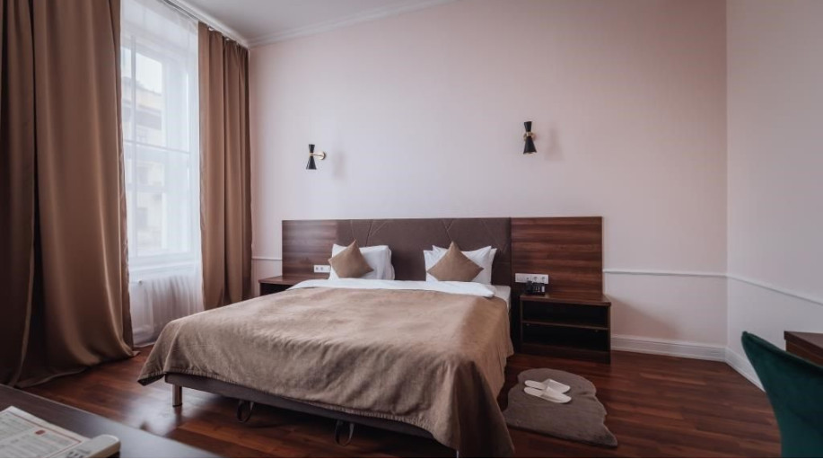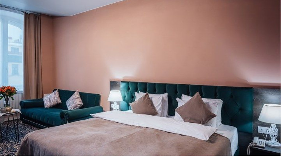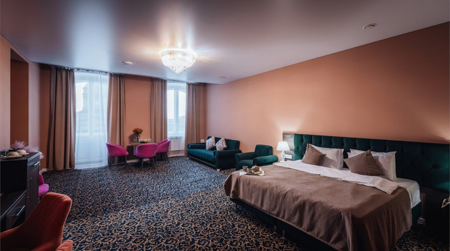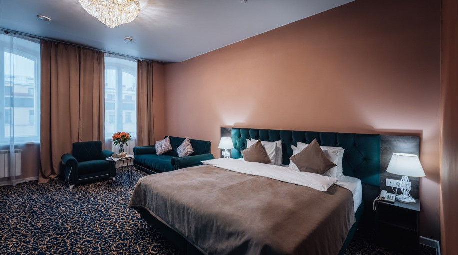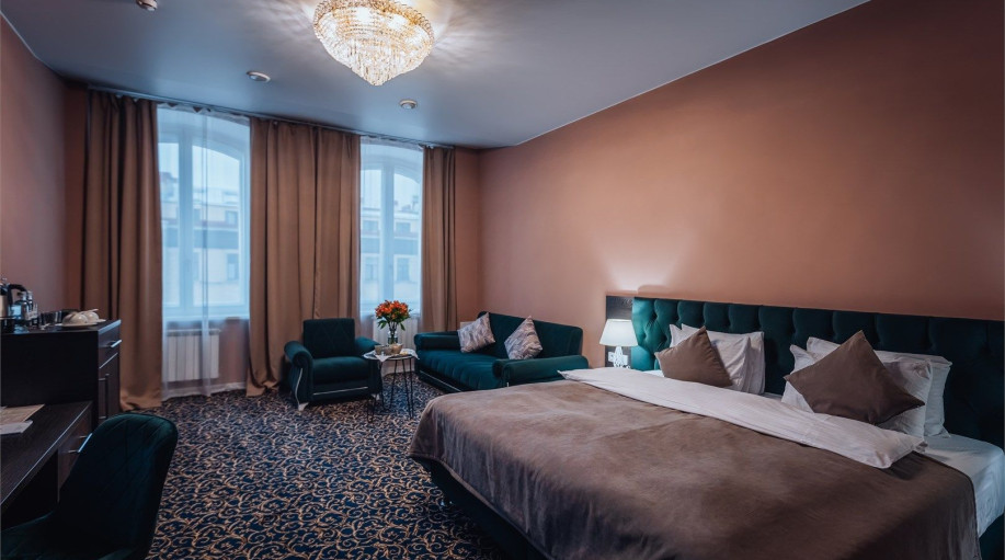 Самый роскошный номер Люкс с собственным балконом и фронтальным видом на Казанский собор делает его главным украшением отеля. Площадь номера - 50 кв. м., расположен на четвертом этаже. В номере отлично сочетаются классический стиль интерьера и современный комфорт. Здесь есть все необходимое для комф..