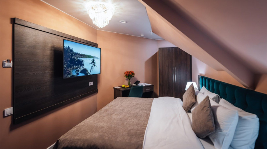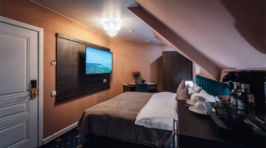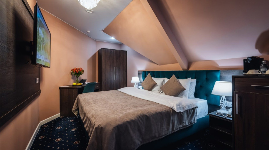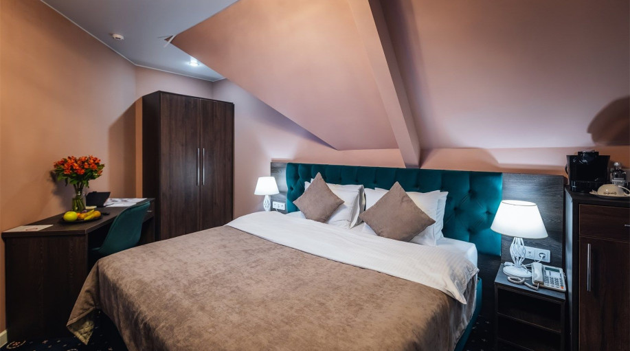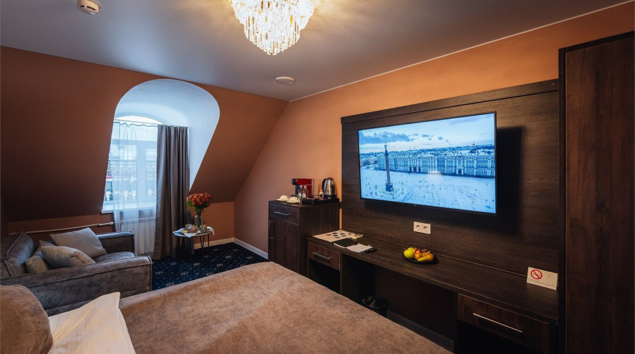 Номера на мансардном этаже отеля дают ощущение простора и романтического уюта, идеально подходят для размещения 1-2 человек. Площадь номера варьируется от 16 до 20 кв.м. Мансардные окна номера выходят во внутренний двор здания - архитектурная особенность Санкт-Петербурга. В каждом номере имеется спа..