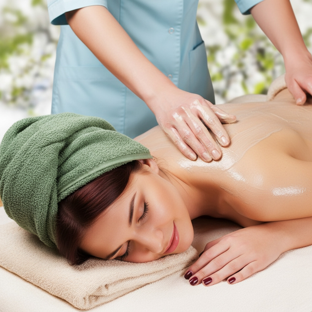 Процедура начинается с нанесения цитрусового пилинга на сухую кожу. Особое внимание уделяется огрубевшим участкам — коленям, локтям и другим зонам. Пилинг мягко удаляет ороговевшие клетки, стимулирует regeneration кожи, очищает поры и усиливает кровообращение, подготавливая кожу к дальнейшим этапам. После нанесения состава выдерживается необходимое время, после чего он смывается тёплой водой. -