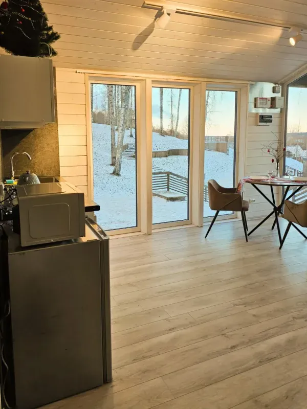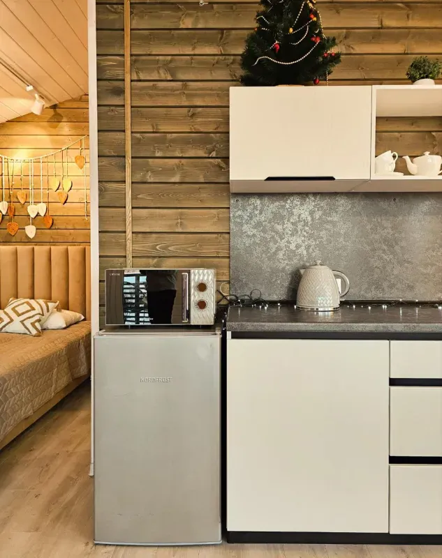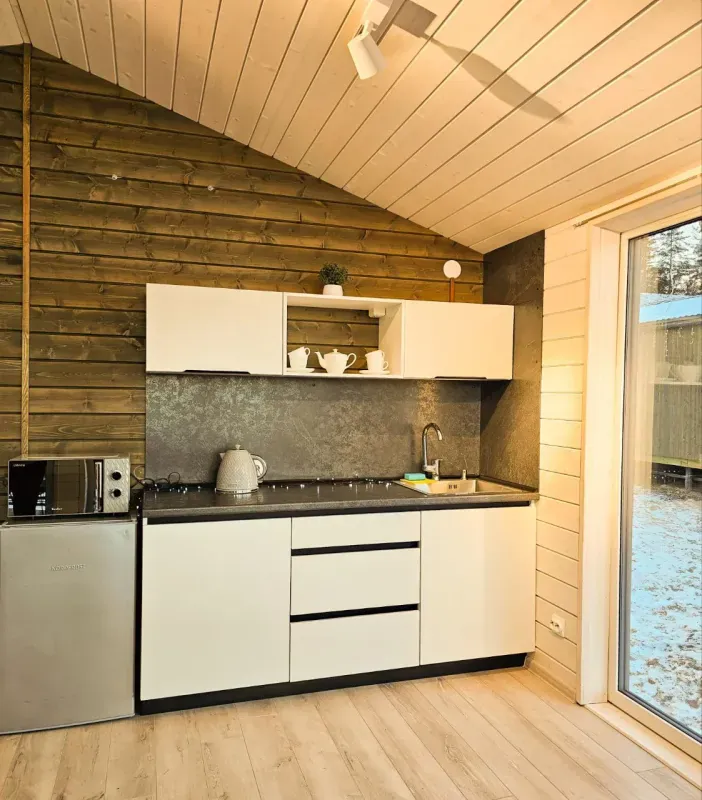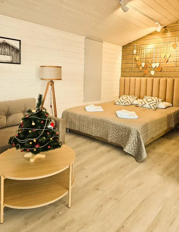 ✔ Небольшой коттедж-студия общей площадью 33 м3. рассчитан на 2-х человек: в общем пространстве находятся спальная зона, гостиная и обеденная зона, отдельно санузел.