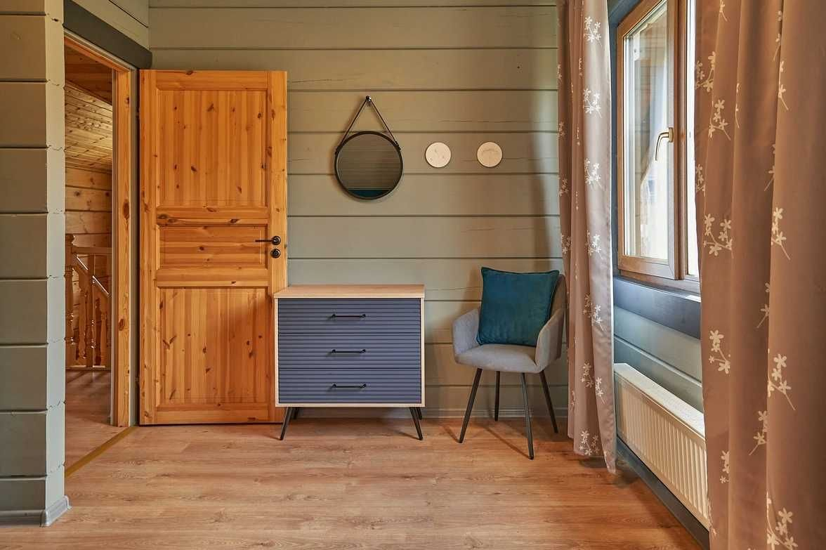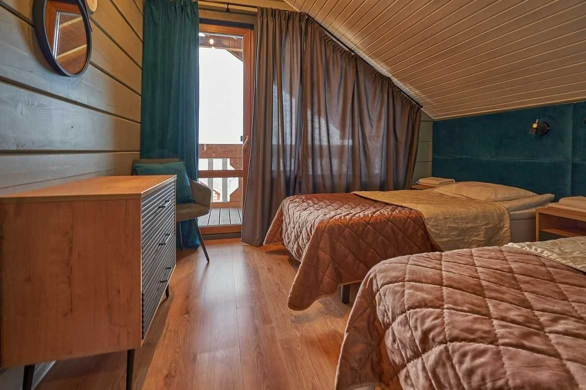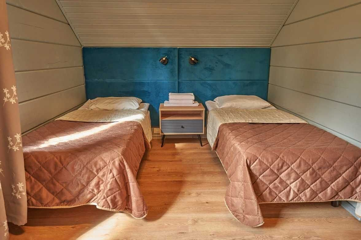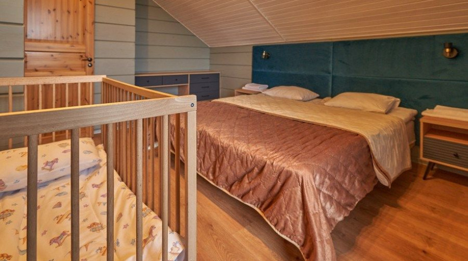 ✔ На втором этаже коттеджа находятся 3 спальные комнаты с финскими односпальными кроватями, которые при желании можно объединить в двуспальную кровать.