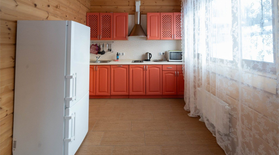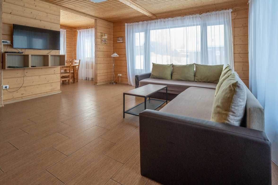 Двухэтажный коттедж, на первом этаже которого расположена полностью оборудованная кухня и уютная гостиная с панорамными окнами.
