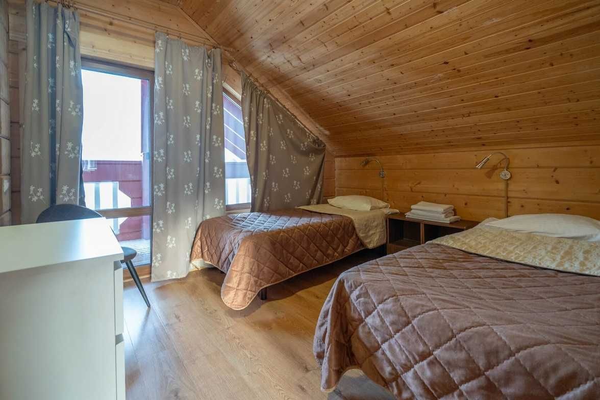 На втором этаже коттеджа находятся 3 спальные комнаты с финскими односпальными кроватями, которые при желании можно объединить в двуспальную кровать.