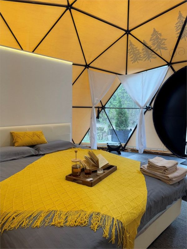 Купольный шатёр в глэмпинге «Ecos 360» - это уникальное сочетание первозданной природы и современного комфорта, где вы сможете по-настоящему отключиться от городской суеты и погрузиться в атмосферу умиротворения.