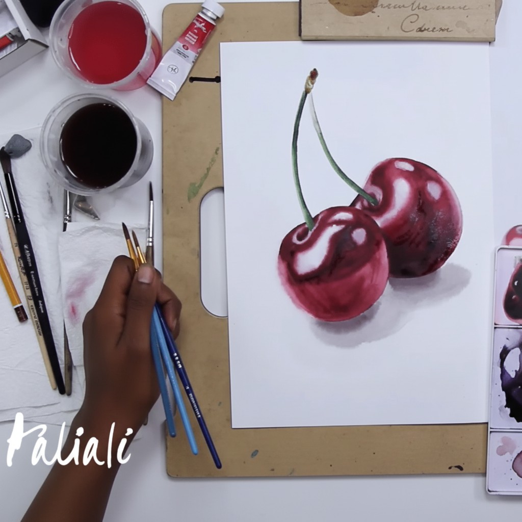 - 2 урока — Вишни и основы светотени. Осваиваем передачу объема на округлых предметах, рисуем монохромную и цветную композиции.