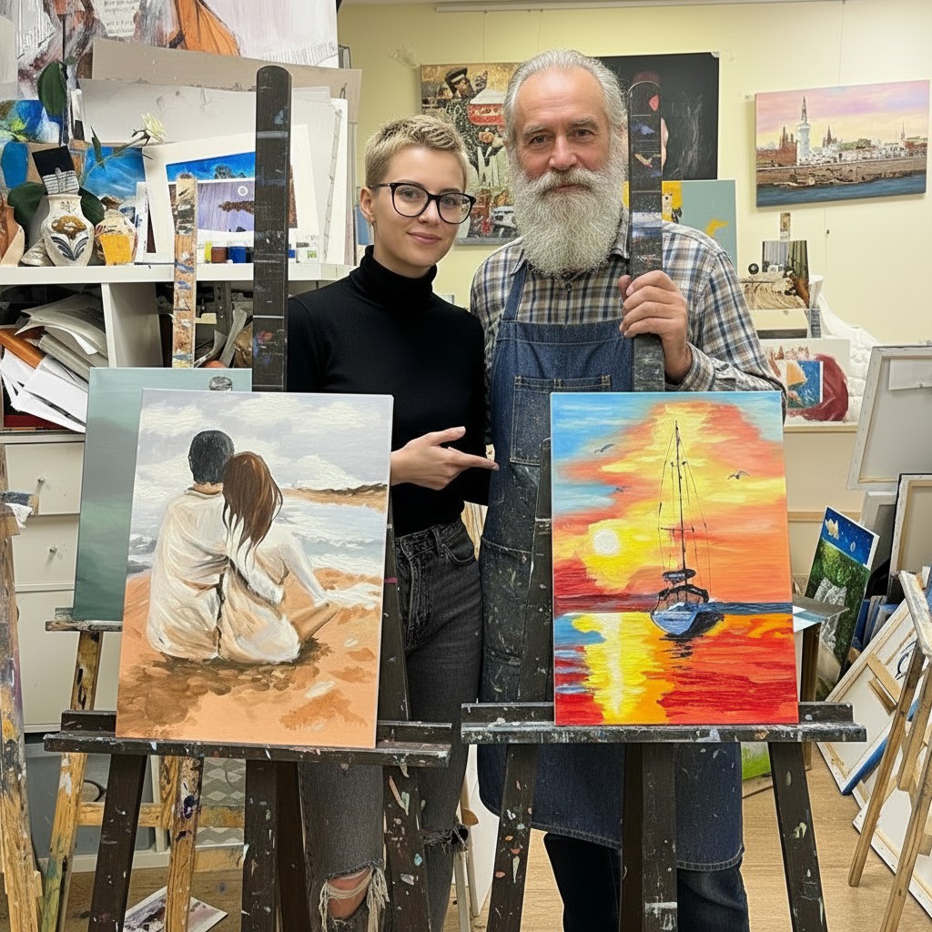 - Формат «арт-мастерской»: в студии одновременно занимаются несколько человек, но художник уделяет внимание каждому отдельно.