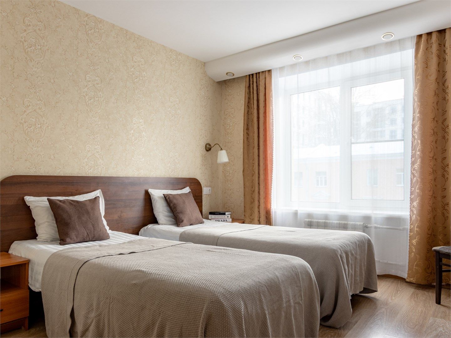 Отель органично вписывается в городскую ткань Петербурга — немного строгий, но сдержанный, тёплый по настроению. Мы сохранили основательность здания и добавили аккуратный, сдержанный интерьер без лишних деталей.