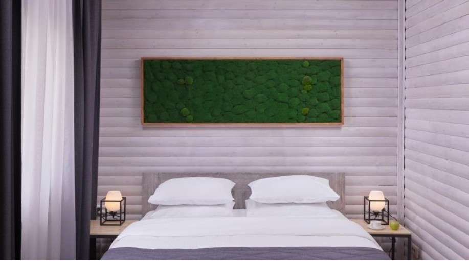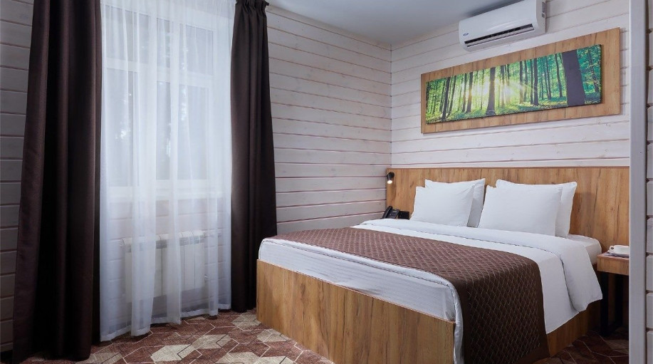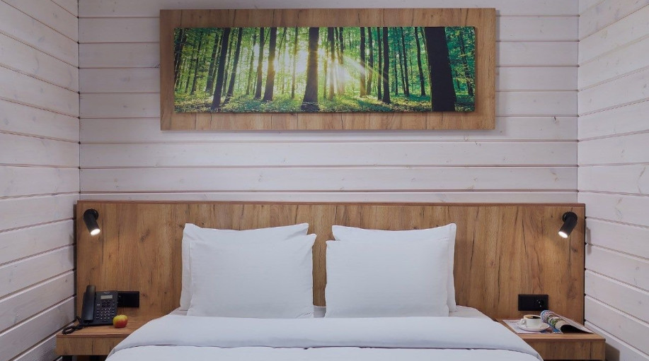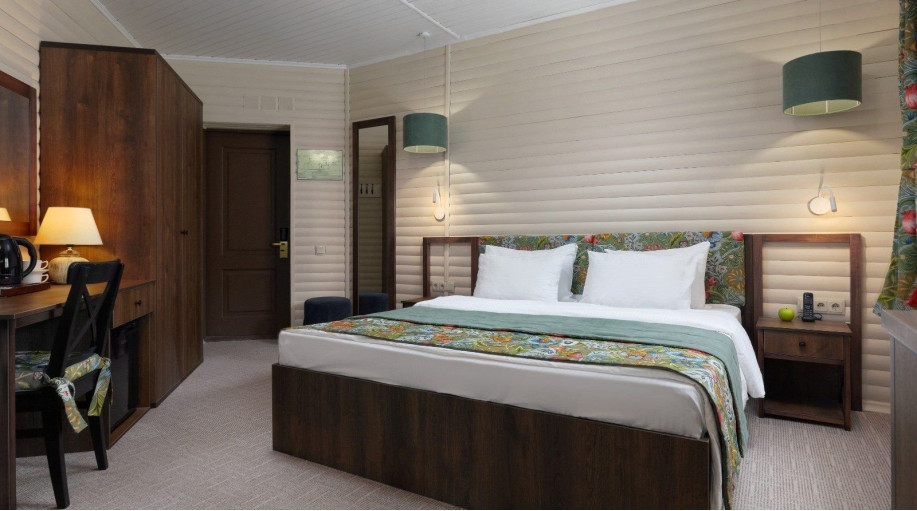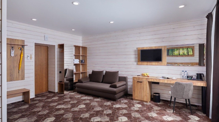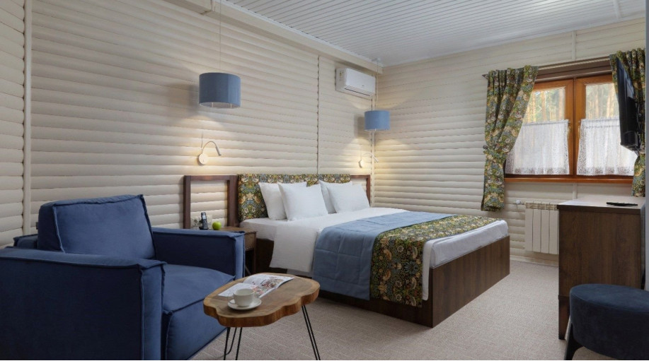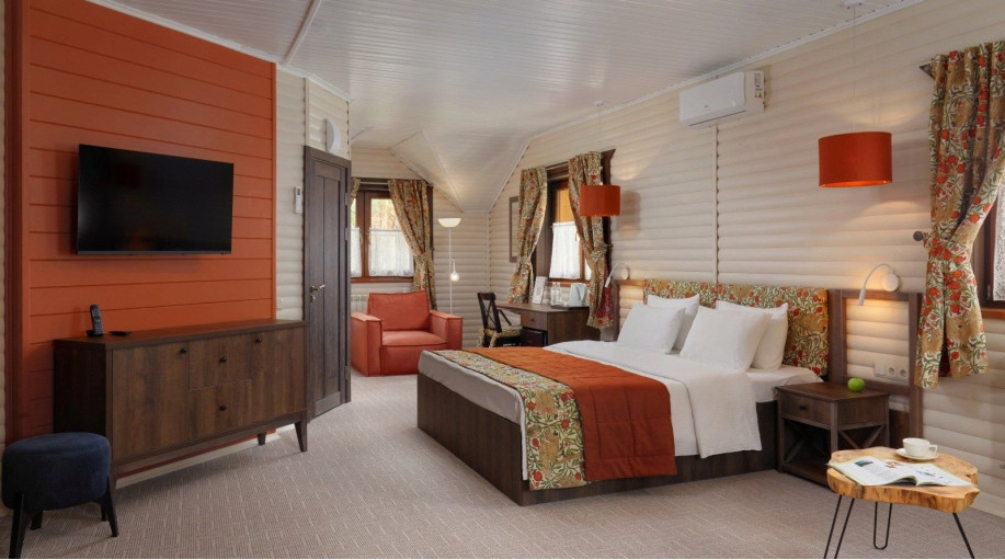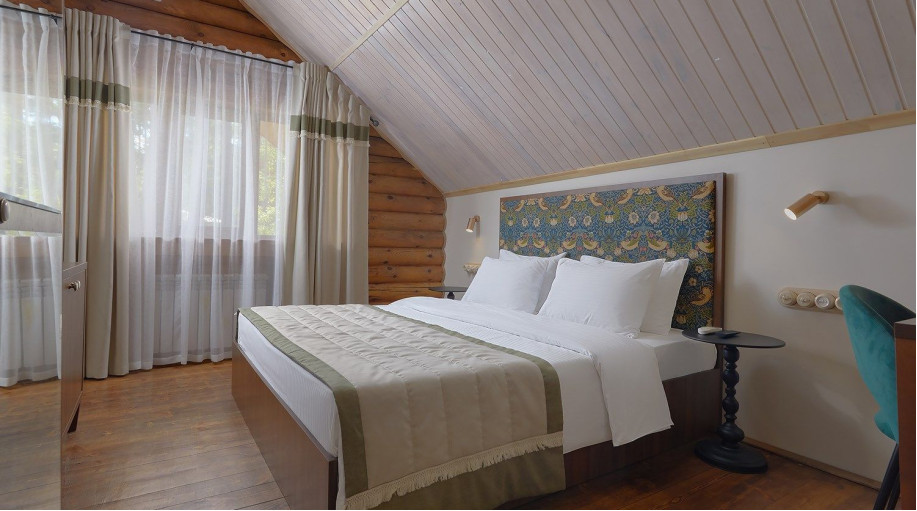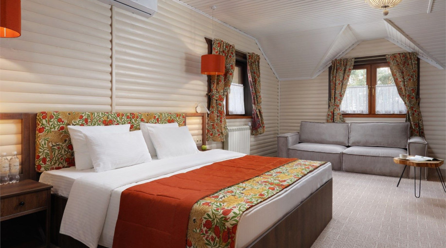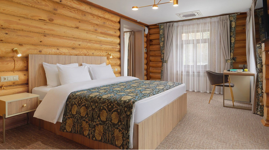 Всего в эко-отеле "ВеЛес" представлено 3 номера данной категории. В каждом из номеров есть двуспальная кровать, раскладной диван, платяной шкаф для одежды, прикроватные тумбочки со светильниками, напольная вешалка.