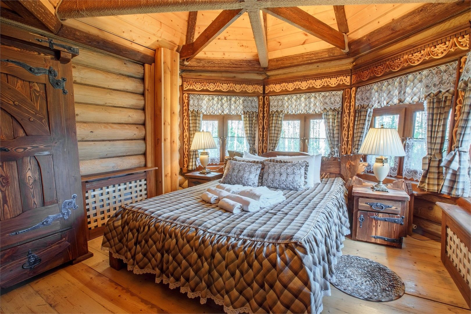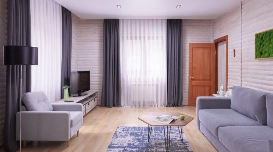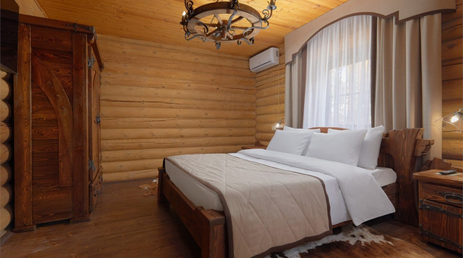 Всего в Эко-отеле «ВеЛес» 8 номеров категории Люкс «Лесной», которые расположены в корпусах. В номере этого типа две комнаты — гостиная и спальня. Эко-направление представлено в деревянной отделке номера.
