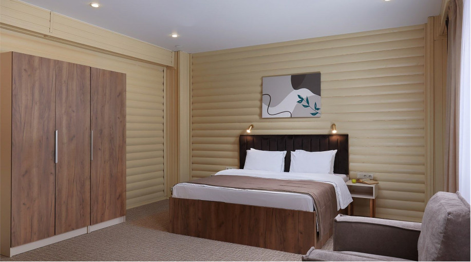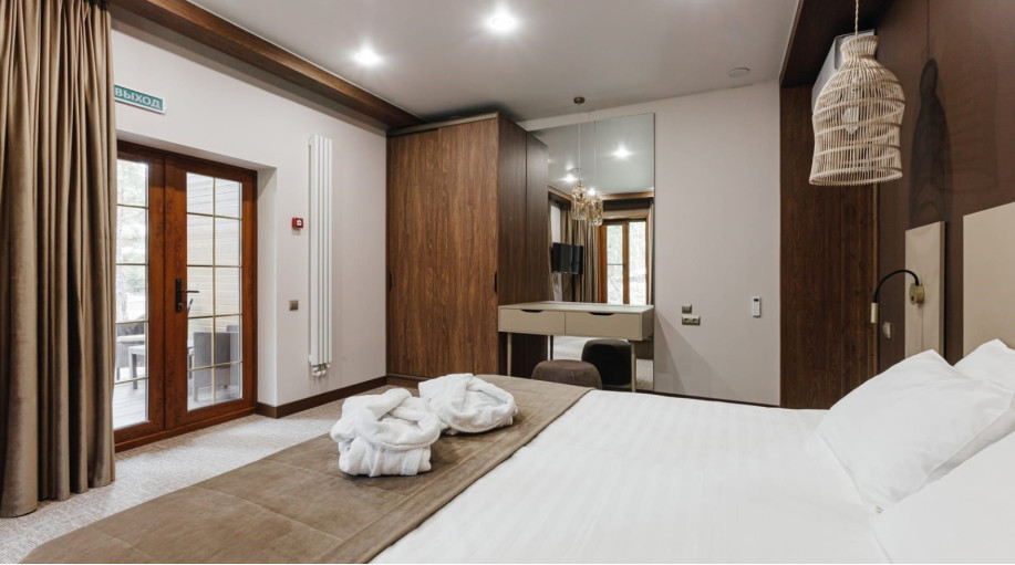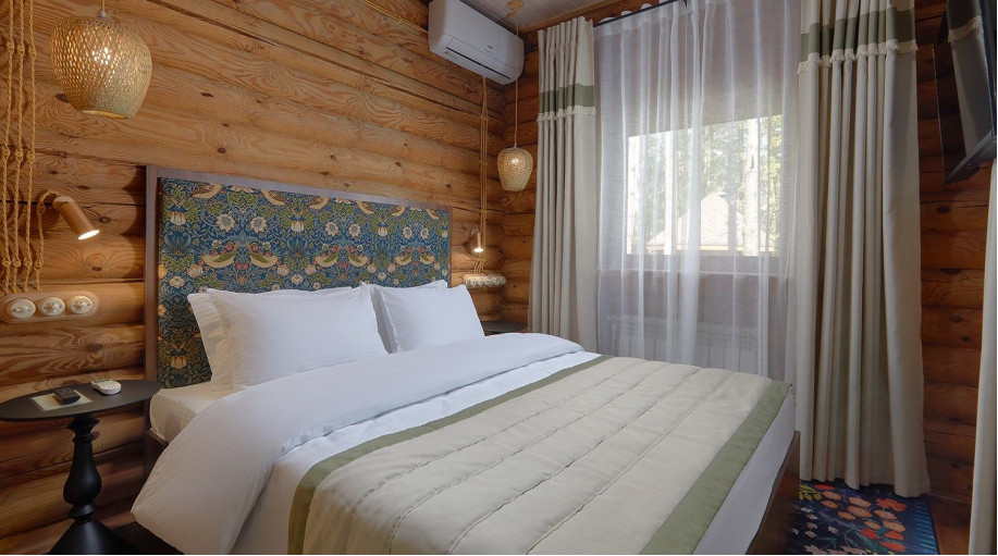 В оформлении интерьеров преимущество отдано натуральным природным материала, а именно дереву. Благодаря такой отделке, в номере комфортно дышать и приятно спать. Сюда приезжают с семьей или с большой дружеской компанией, здесь можно укрыться от суеты современного мира. Всего единовременно отель готов принять до 550 человек.
