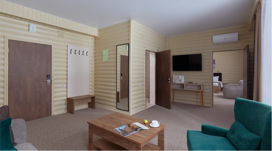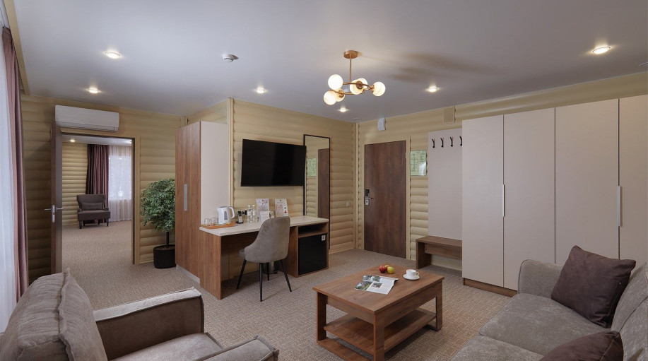 Всего в Эко-отеле «ВеЛес» 4 номера данной категории, которые расположены в корпусах. Интерьер просторного двухкомнатного люкса выполнен в сдержанном классическом стиле. Натуральные материалы и пастельные цвета — основа изысканного дизайна номера.