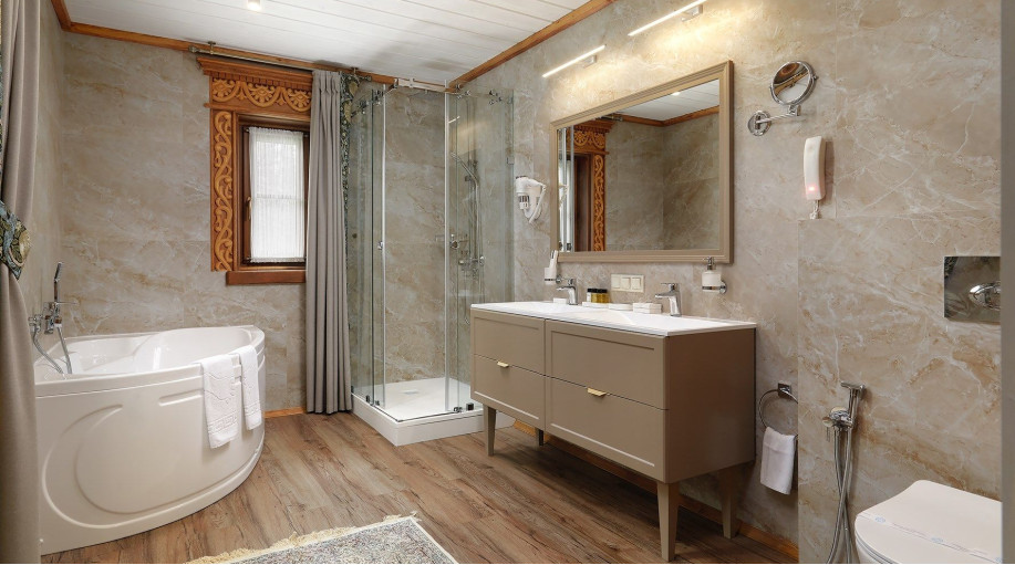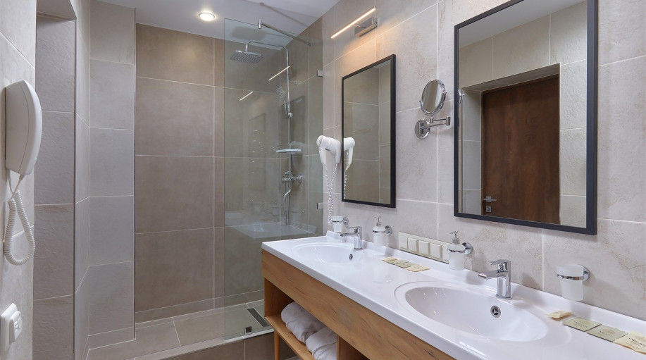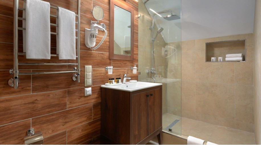 Ванная комната каждого номера оборудована современными душевыми кабинами и феном. В каждый номер предоставляется 2 полотенца, халаты и подстилка для ног, замена которых происходит ежедневно, а также гель для душа и жидкое мыло. Размещение с животными в номерах данной категории запрещено. В отеле предусмотрены два корпуса для проживания с собаками, по наличию номеров необходимо уточнять у менеджеров отеля.