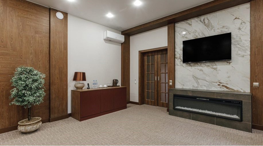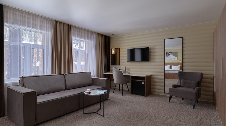 Раздельные спальная и гостиная зоны, стильная удобная мебель - в гостиной имеется удобный раскладной диван, журнальный столик, платяной шкаф, ЖК-телевизор, кондиционер, мини-холодильник. Посуда под напитки – в шкафу. В номерах предусмотрено наличие сейфа для хранения ценных предметов.
