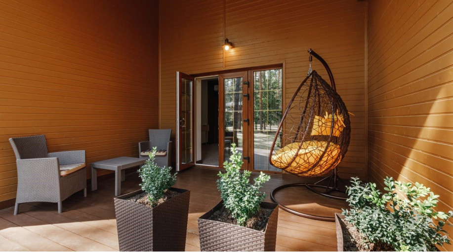 Номер-шале с двумя комнатами, терассой и санузлом. Из окон открывается вид на сосновый лес. Номер оснащен террасой с качелями, которая отлично подходит для завтраков, уютных посиделок и расслабления на свежем воздухе соснового леса.