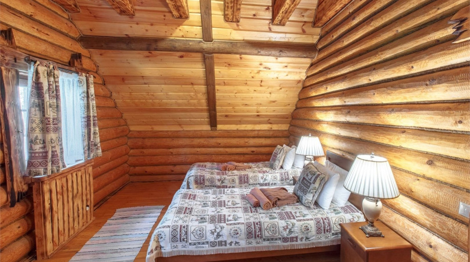 Также на первом этаже расположен каминный зал с диваном, журнальным столиком, торшером, тумбой с ЖК-телевизором. В шкафу для одежды есть вешалки, пледы и сейф. В коттедже 4 спальни: по 2 на каждом этаже. В каждой из комнат стоит большая двуспальная кровать, две прикроватные тумбочки со светильниками, напольная вешалка, полотенца. В коттедже есть возможность разместить два дополнительных места: одно для ребенка и одно для взрослого.