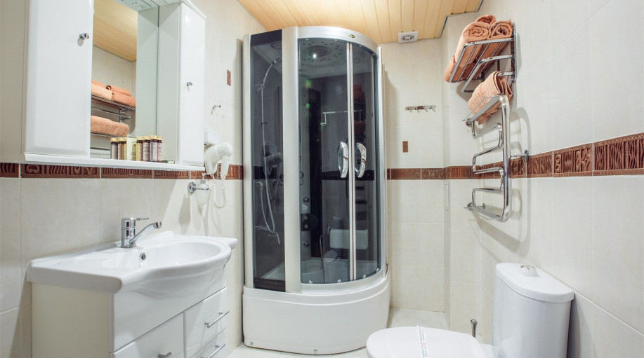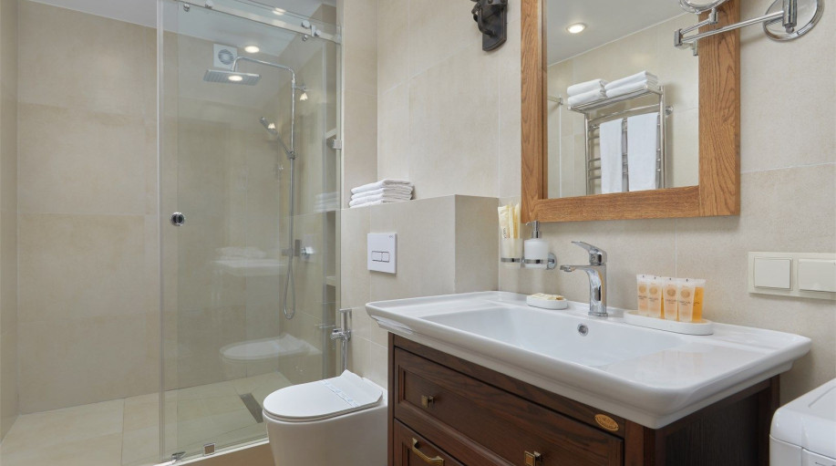 Ванная комната каждого номера оборудована современными душевыми кабинами и феном. В каждый номер предоставляется 2 полотенца и подстилка для ног, замена которых происходит ежедневно, а также гель для душа и жидкое мыло. Проживание с животными в номерах данной категории запрещено.