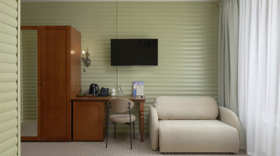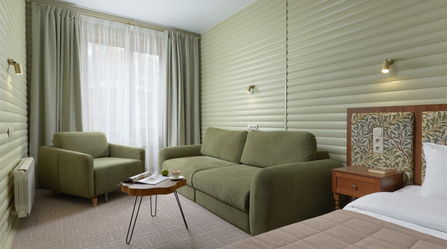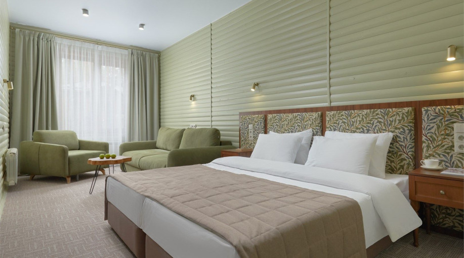 В каждом из номеров есть кровать-трансформер (2 раздельные или сдвинутые вместе), раскладной диван, кресло, платяной шкаф для одежды, прикроватные тумбочки со светильниками, напольная вешалка. Для размещения третьего гостя предоставляется еврораскладушка или детская кровать (при бронировании необход..