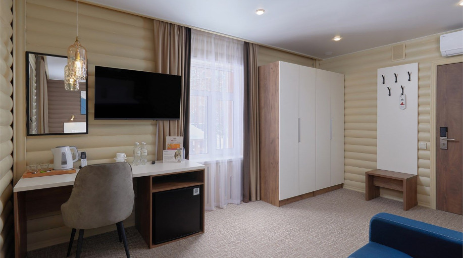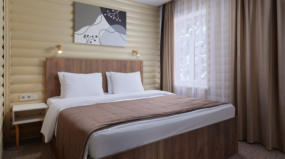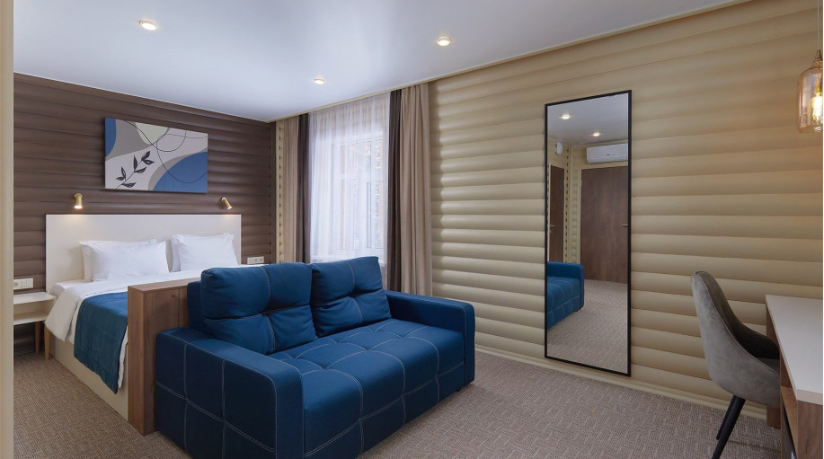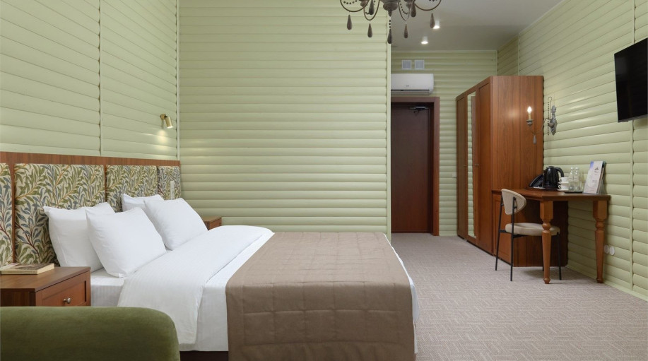 В каждом из номеров есть двуспальная кровать или кровать-трансформер, платяной шкаф для одежды, прикроватные тумбочки со светильниками, напольная вешалка. Для размещения третьего гостя раскладывается кресло или предоставляется детская кровать (при бронировании необходимо указать возраст третьего гостя).
