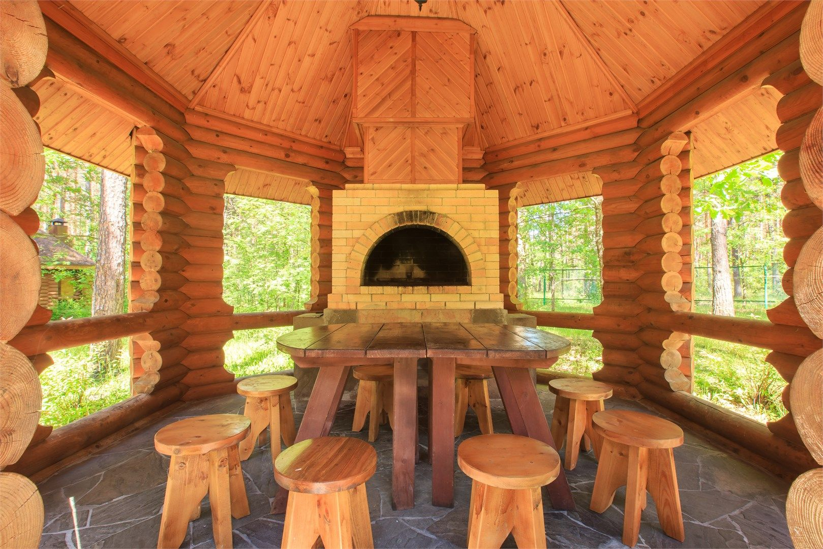 Балкон с потрясающим видом на сосновый бор. Рядом с коттеджем находится беседка для барбекю.
