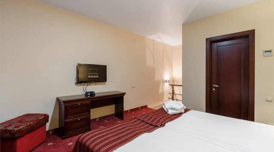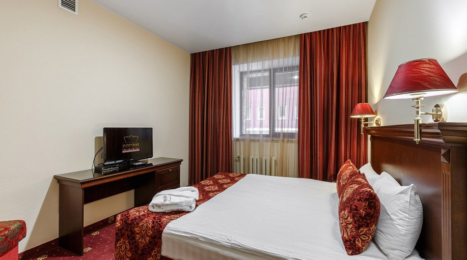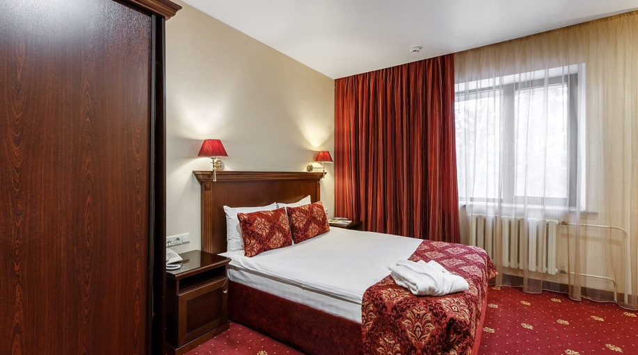Современный большой номер. Площадь номера составляет 30 кв.м. В номере: широкая двуспальная кровать, санузел, фен, холодильник, мини бар, телевизор, междугородняя и международная связь, интернет Wi-Fi (чай, кофе, сахар, чайник), халат, тапочки, система климат-контроля. В номерах категории Комфо..