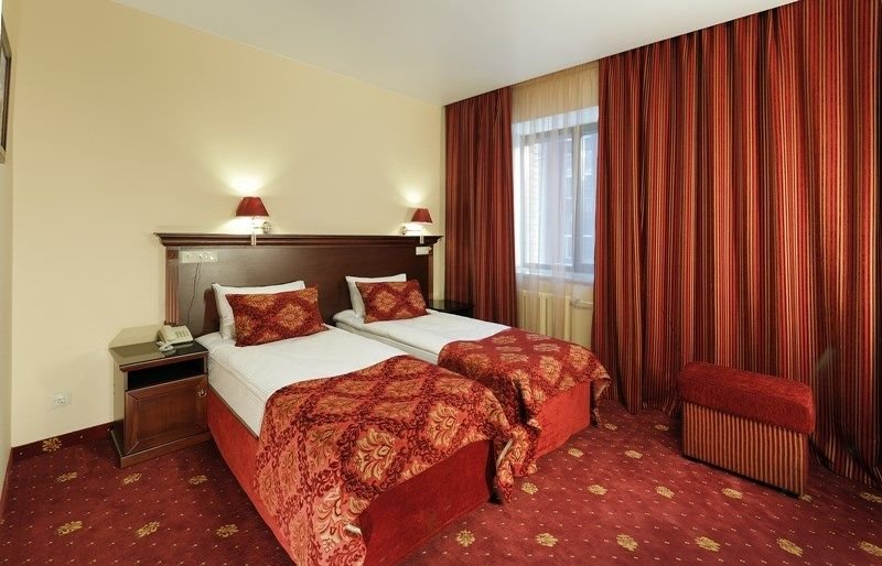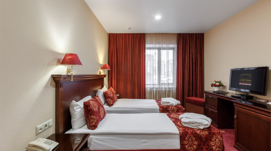 Номер, выполненный в классическом стиле, оборудован двумя односпальными кроватями, удобным рабочим столом, плазменным телевизором с кабельным телевидением и бесплатным Wi-Fi.