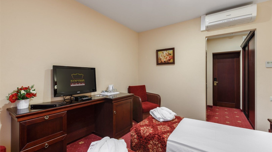 В номере: широкая двуспальная кровать, санузел, фен, холодильник, мини бар, телевизор, междугородняя и международная связь, интернет Wi-Fi (чай, кофе, сахар, чайник), халат, тапочки, система климат-контроля.