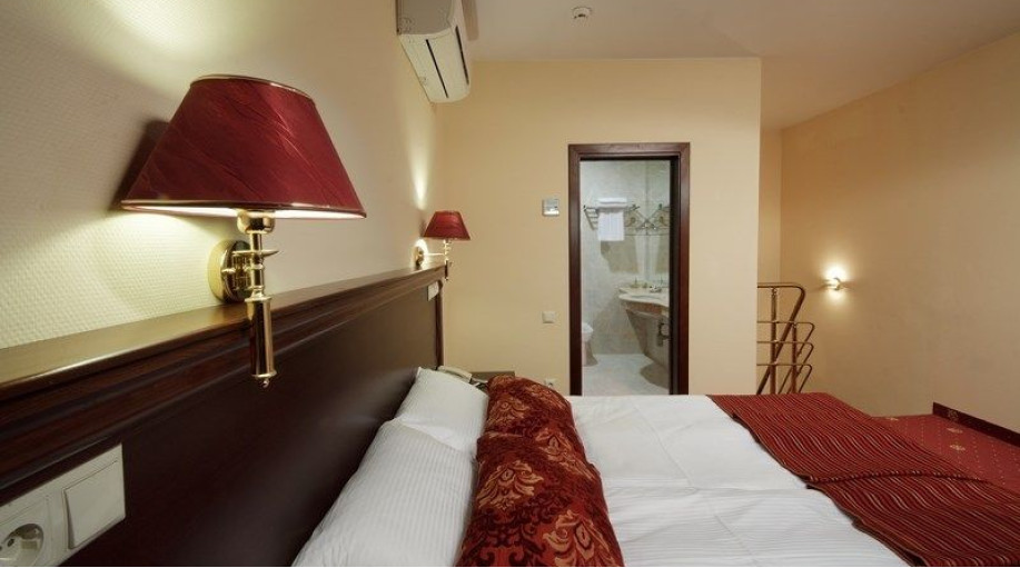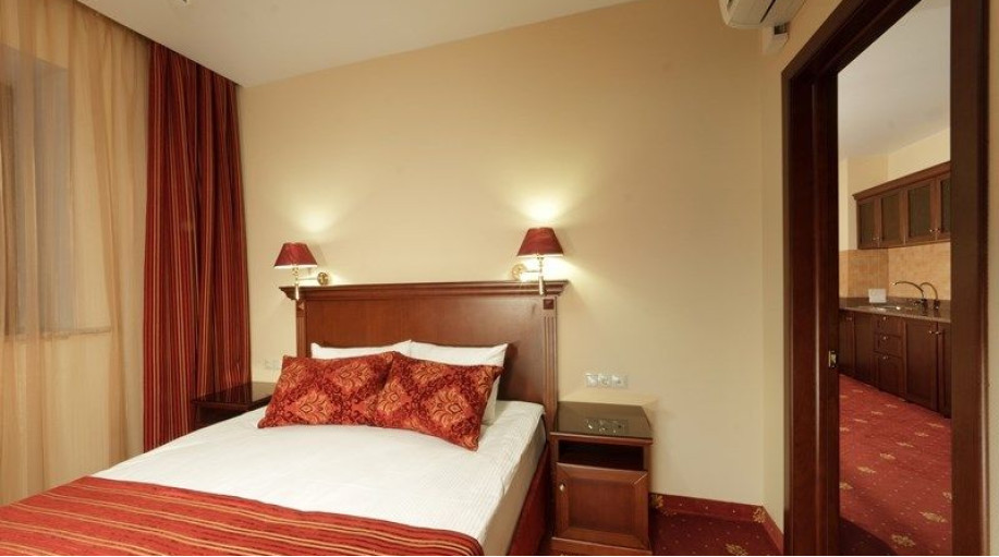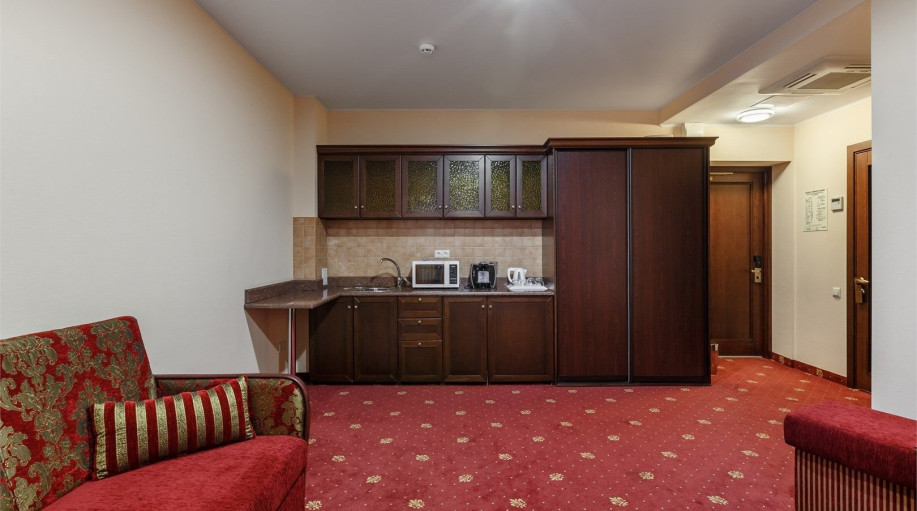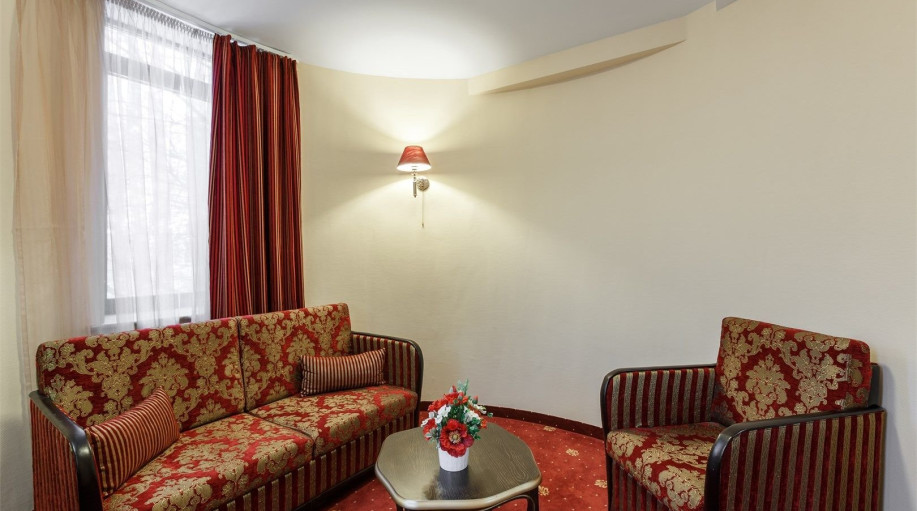 Просторный двухкомнатный номер, состоящий из спальни и гостиной зоны. Площадь номера – 37 кв. метров. Современный интерьер в пастельных тонах. В номере: санузел, холодильник (мини бар), телевизор, междугородняя и международная связь, интернет Wi-Fi, чайная станция (чай, кофе, сахар, чайник), х..