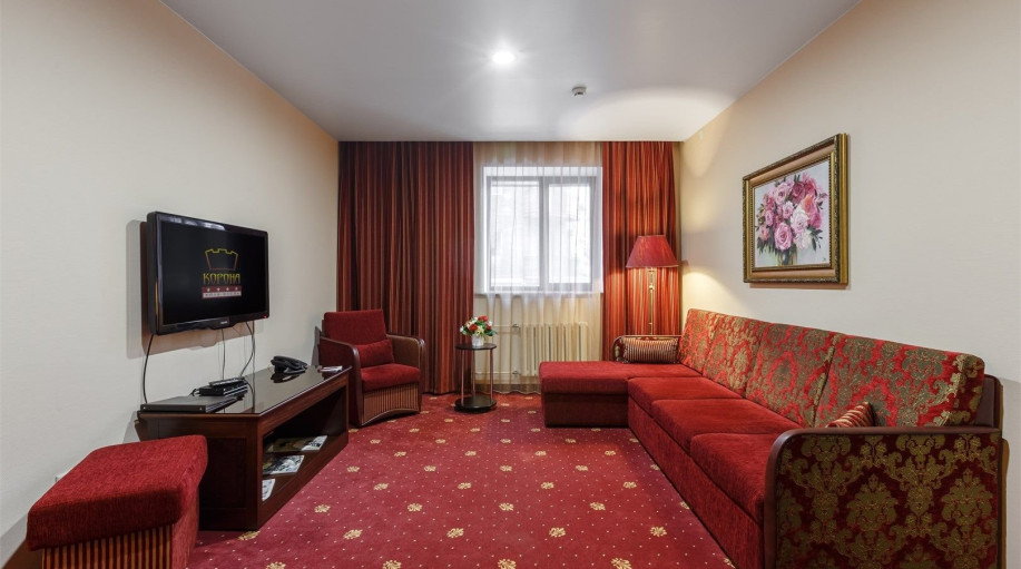Современный большой двухкомнатный номер. Площадь номера составляет 40 кв.м. В номере: широкая двуспальная кровать, диван, кресло, санузел, фен, холодильник, мини бар, телевизор, междугородняя и международная связь, интернет Wi-Fi (чай, кофе, сахар, чайник), халат, тапочки, система климат-контрол..
