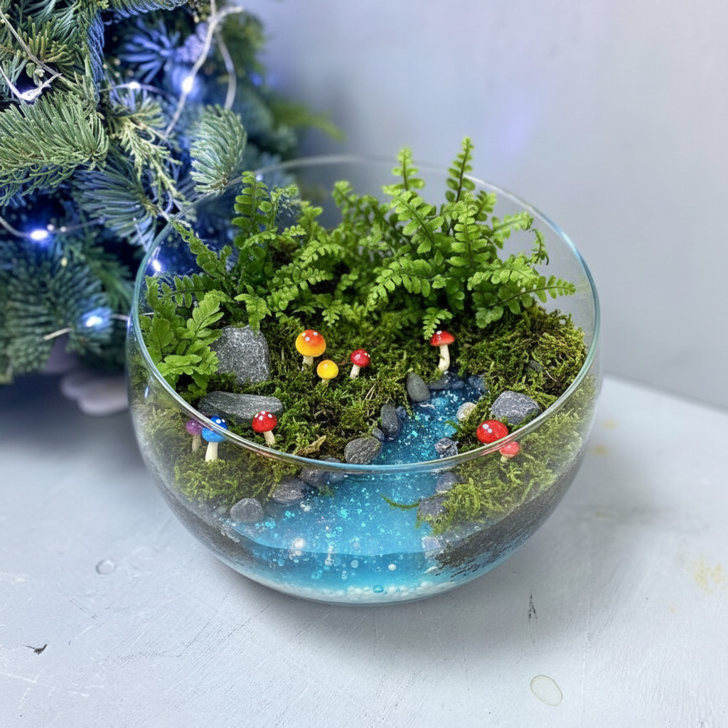 - Можно добавить имитацию водоёма из эпоксидной смолы, фигурки, дополнительные растения по прайсу студии