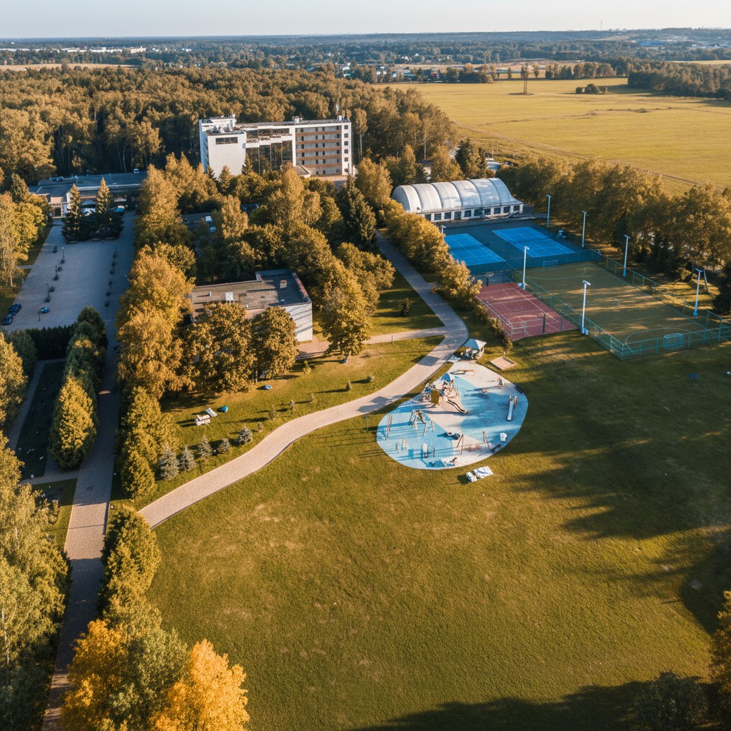 Спорт на свежем воздухе (лето): Открытая спортивная площадка с баскетбольными и теннисными кортами.