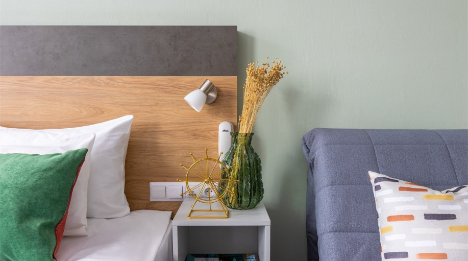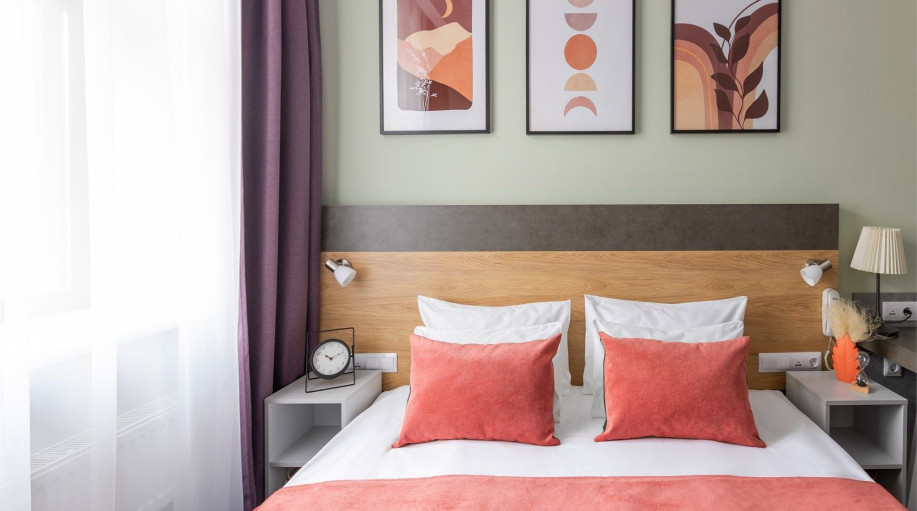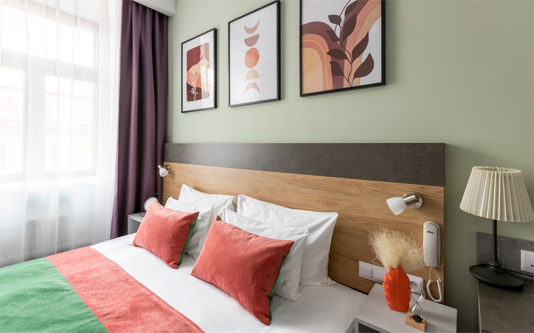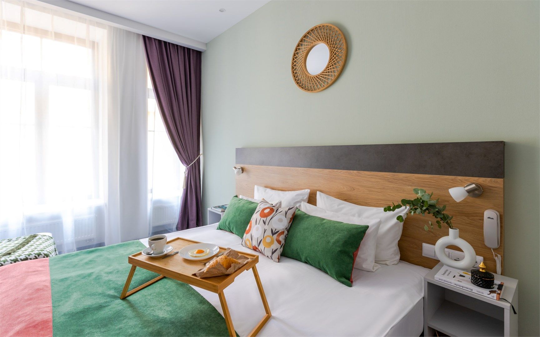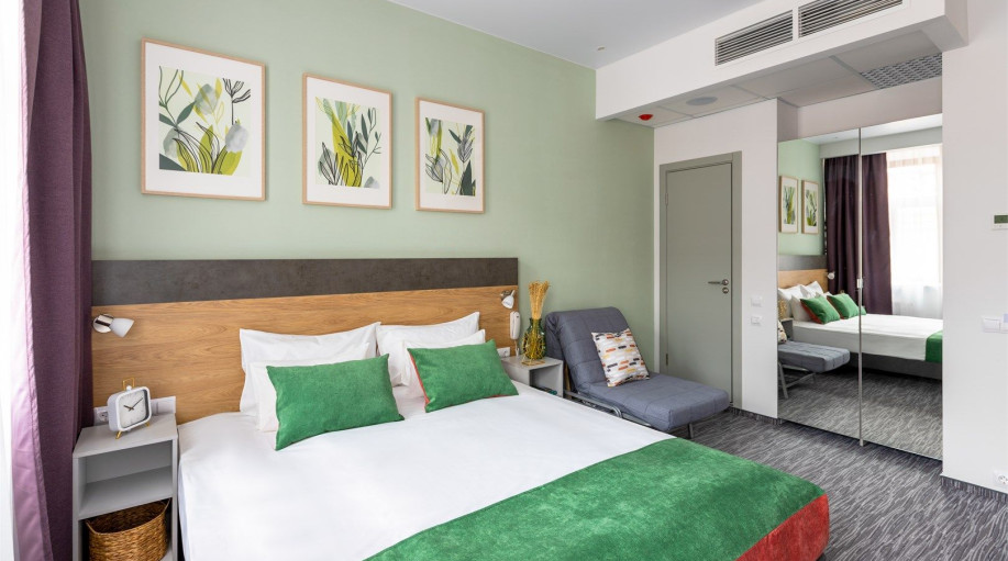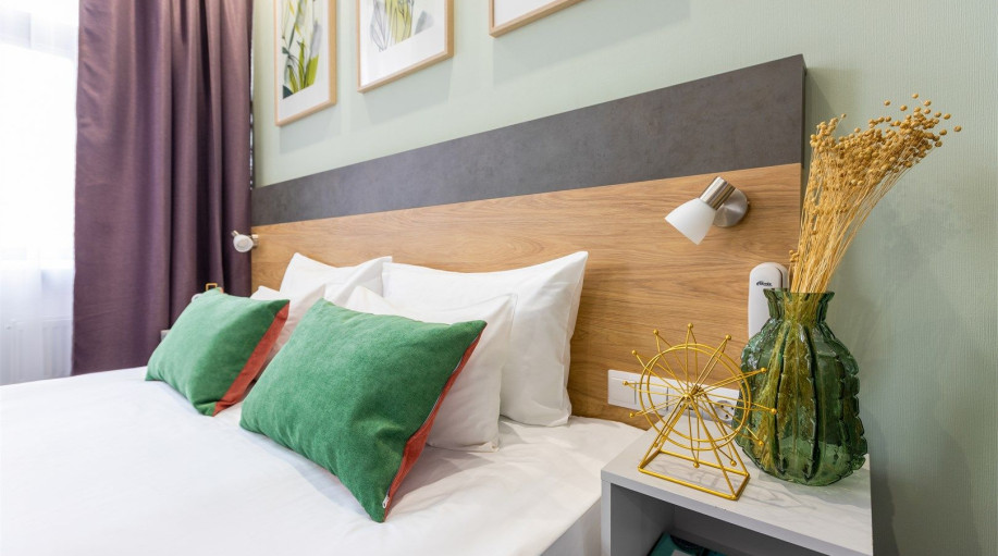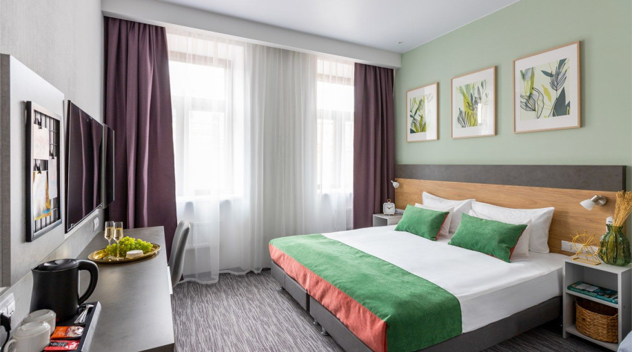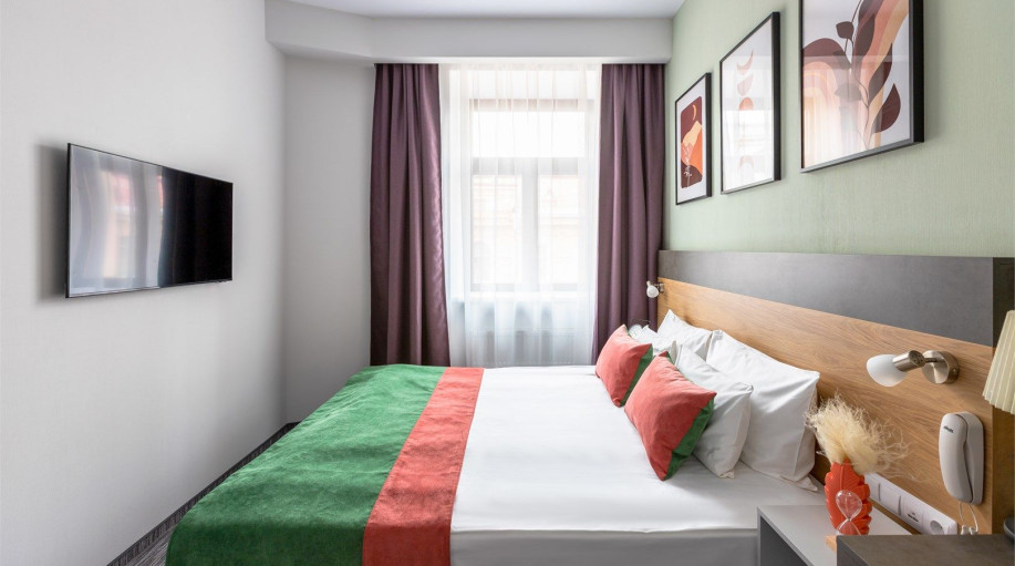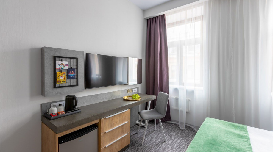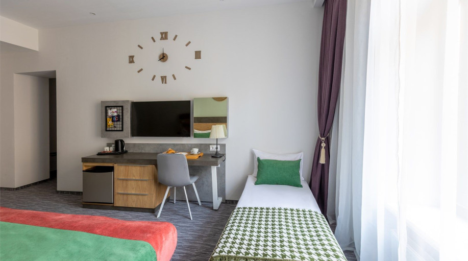 Позвольте себе отдых как сочетание комфорта и изысканного дизайна! Просторный и стильный однокомнатный номер Модерн площадью 23 кв. м. с видом на город или во внутренний двор отеля предназначен для одного, двух или трёх гостей. Декор выдержан в светлых тонах с яркими нотками и деталями интерьера, со..