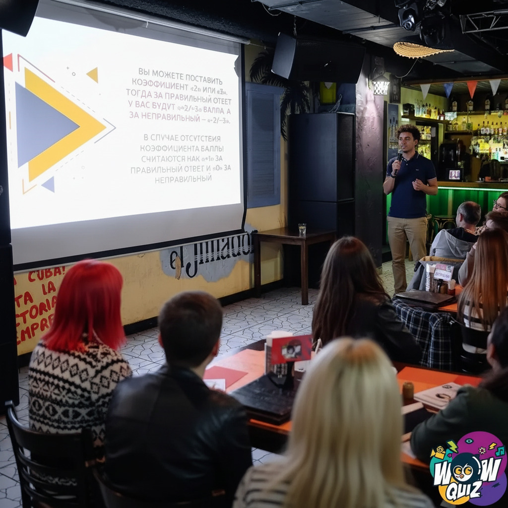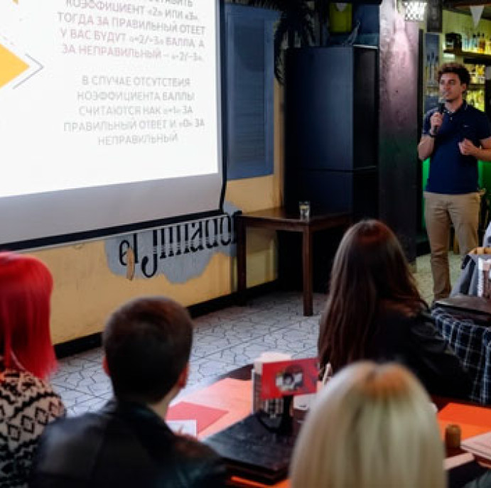 Игра проводится в уютных барах города. Точное место и адрес мы уточним при вашей записи. Ведущий зачитывает вопросы, которые параллельно выводятся на экраны. Команды совещаются и записывают ответы в специальные бланки, которые сдают после каждого раунда. Форматы вопросов поражают разнообразием: текстовые загадки, видеофрагменты, перевернутые песни и многое другое! А пока вы ломаете голову над ответами, вас ждут вкусные угощения, прохладительные напитки и бурные совместные обсуждения.